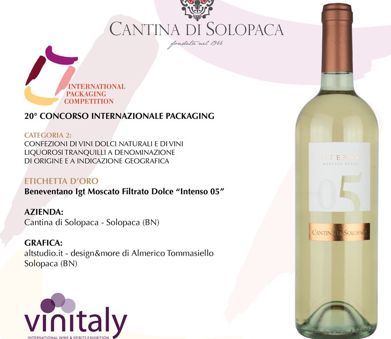 La giuria del 20° Concorso Internazionale Packaging di Vinitaly ha assegnato al Moscato beneventano “Intenso 05” l’etichetta d’oro, ovvero il primo posto nella categoria confezioni di vini dolci naturali e di vini liquorosi tranquilli a denominazione di origine e a indicazione geografica.