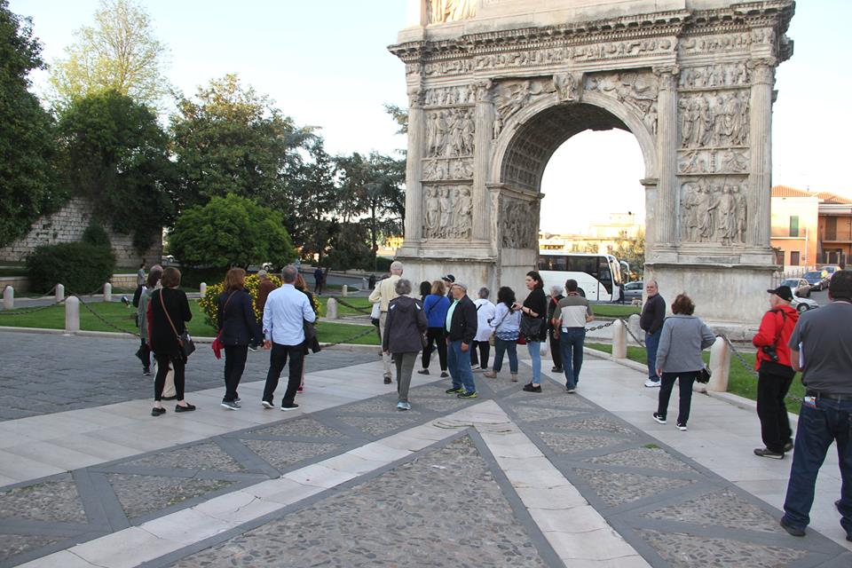 Benevento si è svegliata questa mattina con l’arrivo di una trentina di turisti statunitensi che hanno visitato il centro storico. Ad immortalare il momento “storico” il fotografo del portale “Sannio Report” Felice Presta, che ha scattato alcuni momenti della visita seppur breve degli esploratori. Un tour tra le bellezze della città, a partire dall’Arco di traiano “scoperchiato” da qualche mese, fino ad arrivare lungo il salotto di Benevento. Tra un selfie e una chiacchierata, i turisti hanno ammirato i monumenti oltre all’Arco anche Sant’Ilario a Port’Aurea e i vicoli della movida “infettati” dai vandali che da anni rovinano la storia a partire dai murales su muri e panchine, fino ad arrivare alla spazzatura che regna sovrana. Benevento può risorgere, se nei prossimi anni la prossima amministrazione la sappia rivalorizzare, sia dal punto di vista lavorativo che turistico e che il turismo a Benevento non sia solo di passaggio.