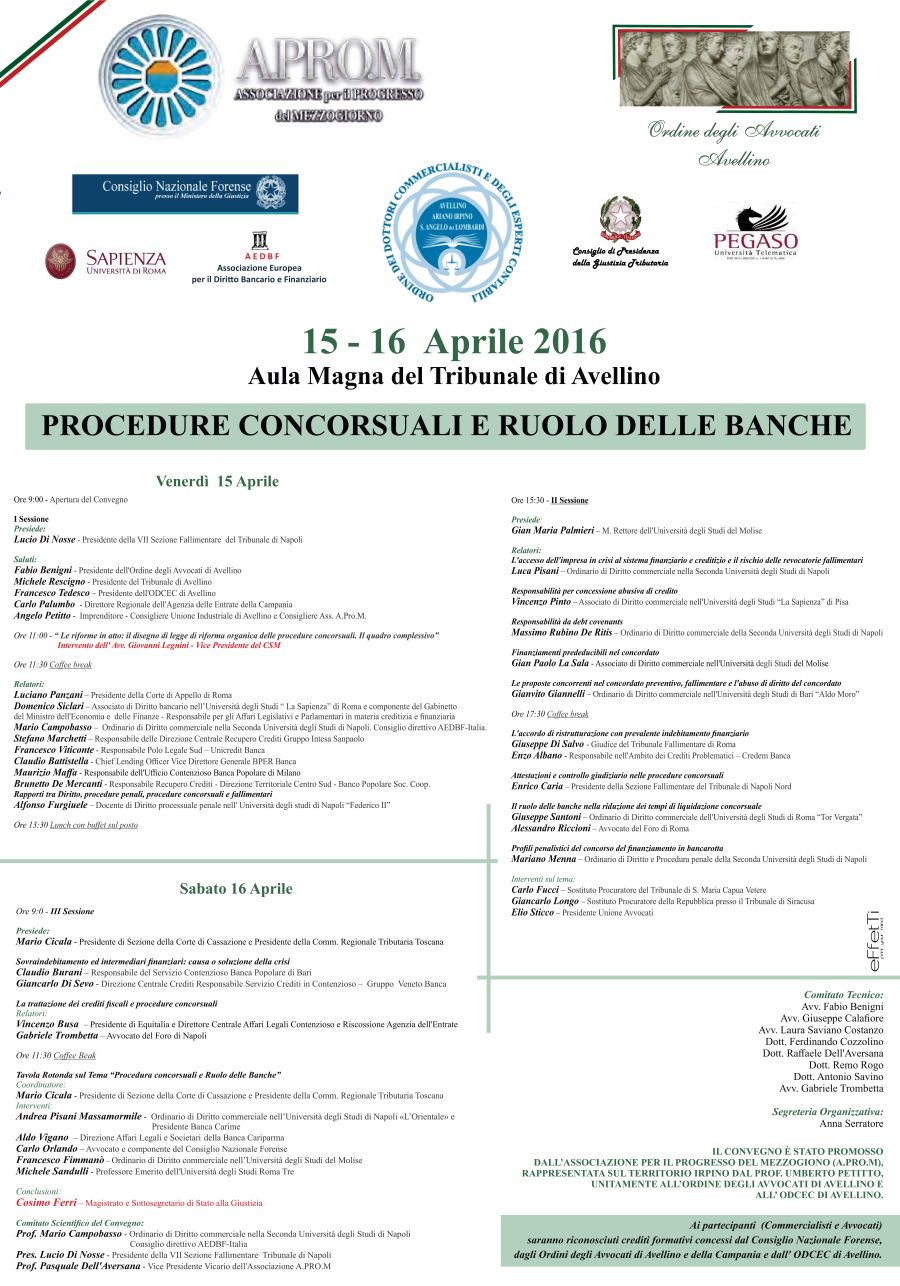 Le nuove regole relative alle procedure concorsuali ed il ruolo delle banche saranno gli argomenti al centro di un’interessante due giorni che si terrà i prossimi 15 e 16 aprile presso l’aula magna del Tribunale di Avellino. Ad organizzare l’evento, cui prenderanno parte, tra gli altri, l’avvocato Giovanni Legnini, vice presidente del Csm, e il magistrato Cosimo Ferri, sottosegretario alla Giustizia, Aprom (Associazione per il progresso del Mezzogiorno), Consiglio nazionale Forense, Ordine dei Commercialisti e degli Esperti Contabili di Avellino, Ariano Irpino e S. Angelo dei Lombardi, dall’Ordine degli Avvocati di Avellino, dall’Università La Sapienza di Roma, dall’Università Telematica Pegaso e dall’Associazione Europea per il diritto bancario e finanziario. La due giorni sarà un confronto a più voci che vedrà anche la partecipazione degli imprenditori, tra cui Angelo Petitto del Gruppo Petitto, consigliere Confindustria Avellino e consigliere Aprom. “Credo sia un momento di importante riflessione – spiega Petitto -. Sarà importante anche per mettere sul tavolo alcuni argomenti relativi allo sviluppo del Mezzogiorno e della Campania. In tal senso, lancio un appello ai miei colleghi imprenditori: da soli non si va da nessuna parte, per rimettere in moto l’economia è necessario fare rete”. Petitto a tutto campo, dunque. Con lui abbiamo discusso anche di Confindustria e del presidente designato, Vincenzo Boccia, campano doc, al quale Petitto fa un grosso in un bocca al lupo.