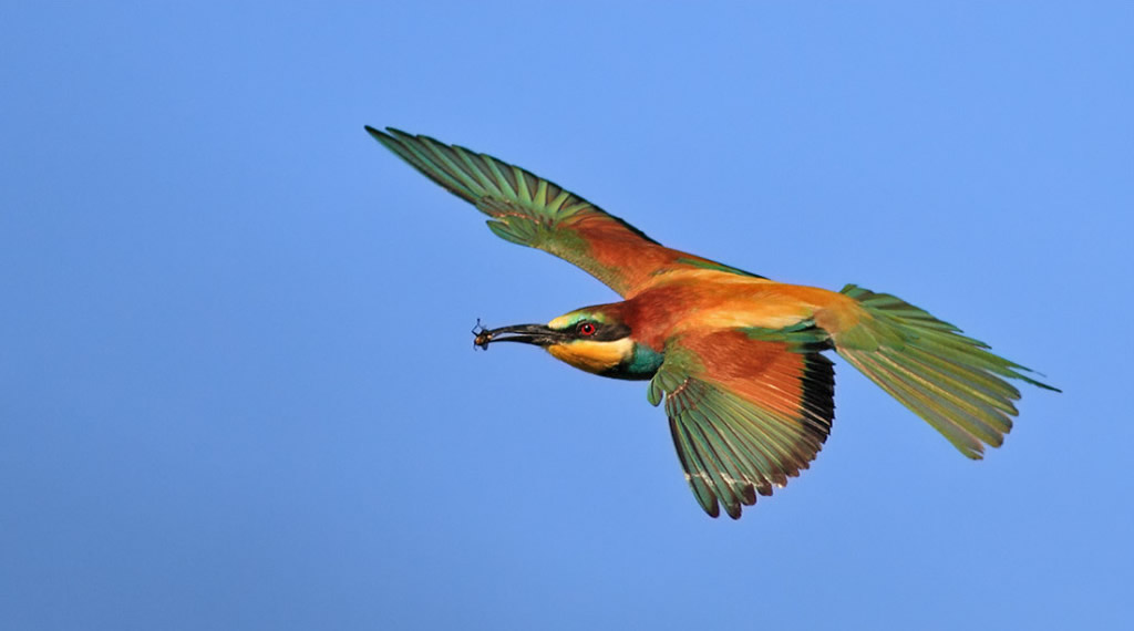 Il gruccione è un uccello variopinto, dai colori vivaci, con un becco lungo e appuntito, anche se un po’ ricurvo, estremamente forte che gli serve per catturare le prede e per scavare gallerie nelle pareti di terra dove nidifica. Questo volatile sverna nell’Africa centrale ed effettua un grande viaggio migratorio per venire a nidificare in Europa (ma si riproduce anche nell’Africa settentrionale). Il suo cibo preferito sono vespe, calabroni, bombi e api, ma mangia anche altri insetti che si librano nell’aria catturandoli in volo.