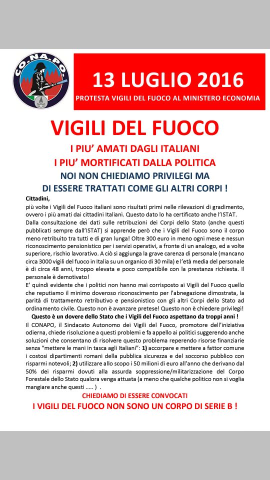 IMG-20160713-WA0014 ROMA- Ha raggiunto la Capitale un folto gruppo dei Vigili del fuoco di Benevento per prendere parte alla protesta davanti alla sede del Ministero dell’ Economia.  La mobilitazione, seppur in toni silenziosi in memoria delle vittime in Puglia,  fa seguito alle numerose proteste che nei mesi scorsi  il sindacato Conapo ha organizzato a Roma presso le sedi nazionali del partito democratico e nuovo centro destra, dopo aver protestato al Ministero dell’ Interno, al Ministero della  Pubblica Amministrazione e in tutte le province d’Italia presso le prefetture.