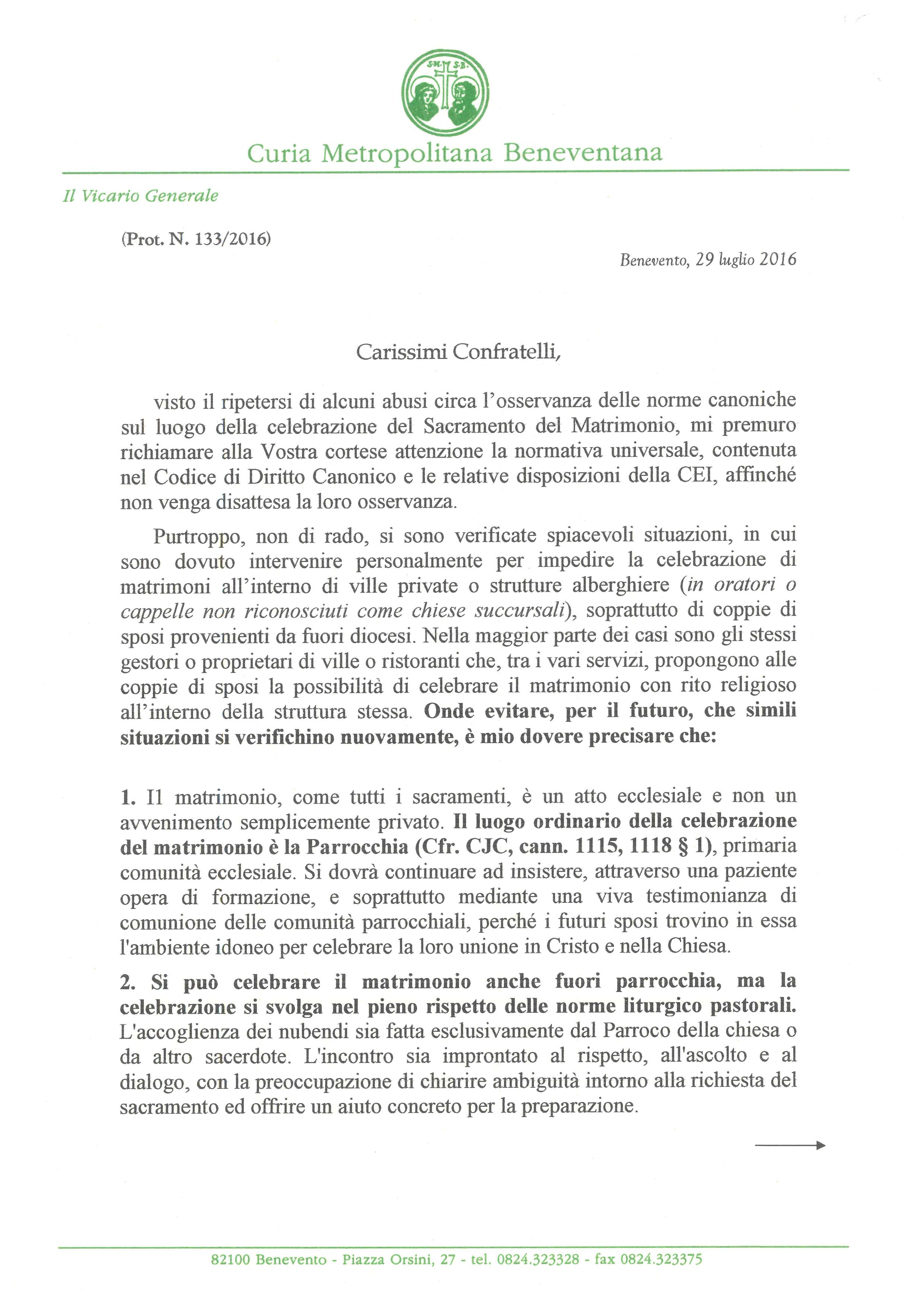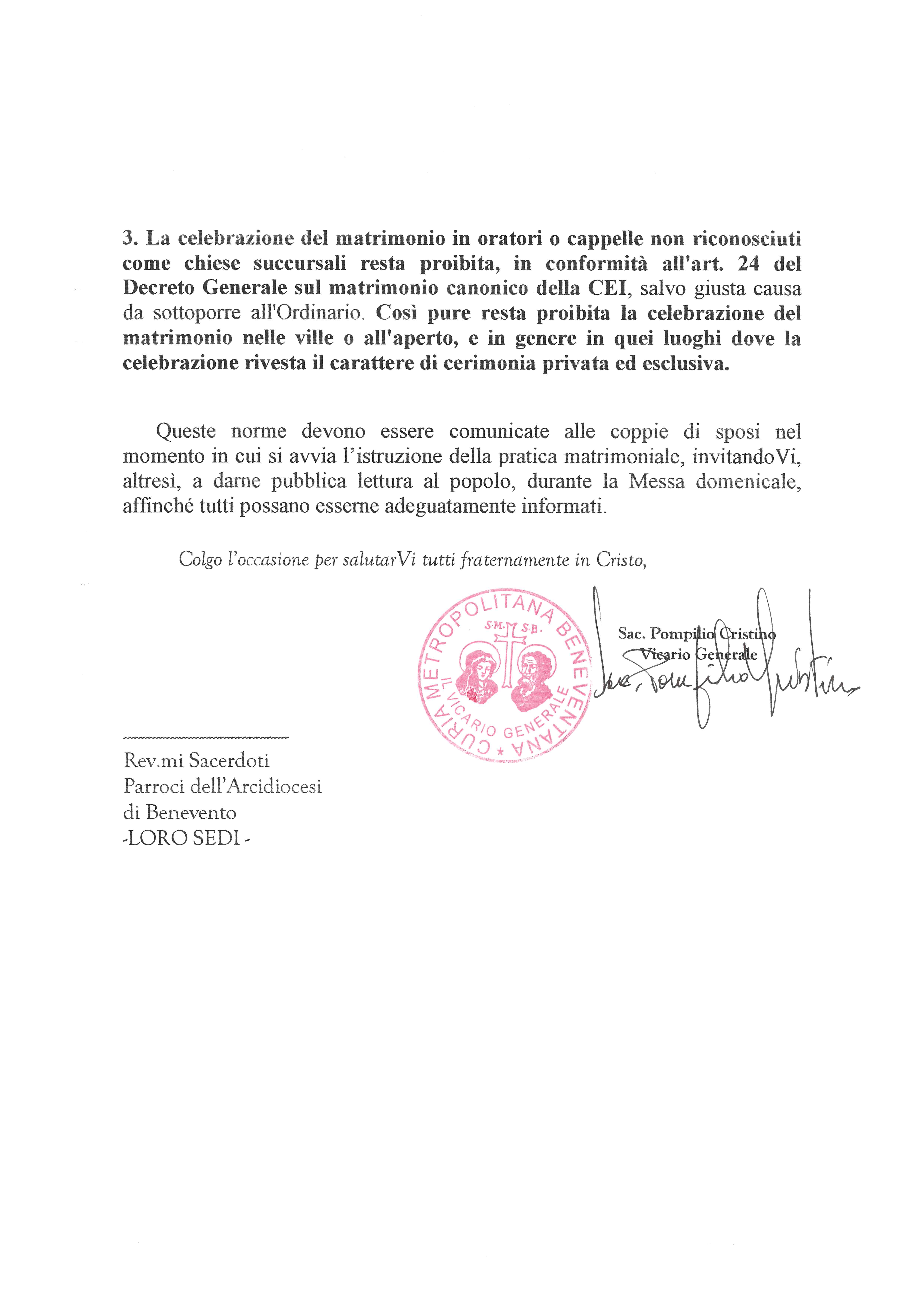 “Visto il ripetersi di alcuni abusi circa l’osservanza delle norme canoniche sul luogo della celebrazione del Sacramento del Matrimonio – scrive don Pompilio Cristino – nella notta pubblicata anche sul sito dell’Arcidiocesi di Benevento – mi premuro di richiamare alla vostra cortese attenzione la normativa universale.