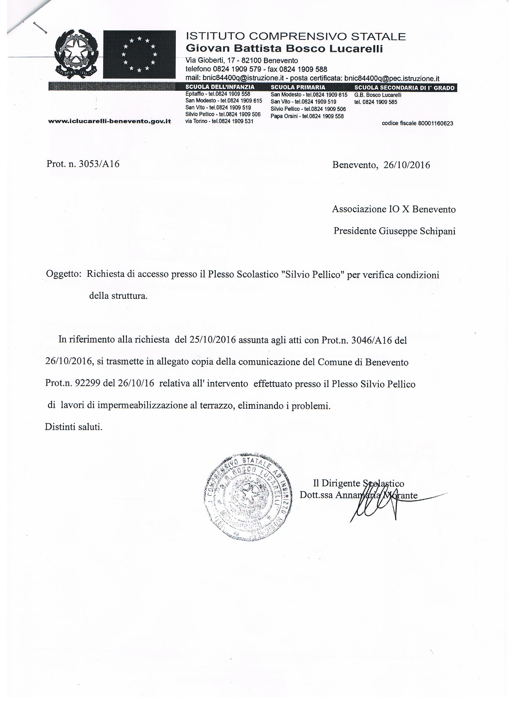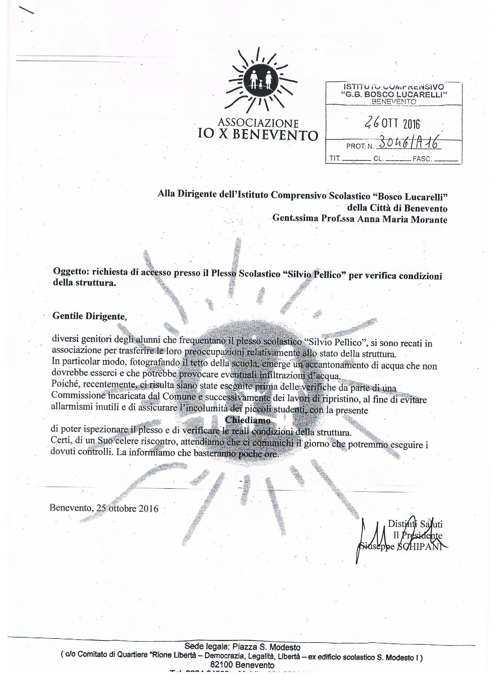 In data 26 ottobre 2016, la nostra associazione, per volontà dei genitori dei piccoli alunni, ha provveduto a depositare con prot. N. 3046/A16, presso la segreteria dell’Istituto Comprensivo “Bosco Lucarelli”, una richiesta di autorizzazione per accedere nel Plesso e verificare le reali condizioni della struttura.