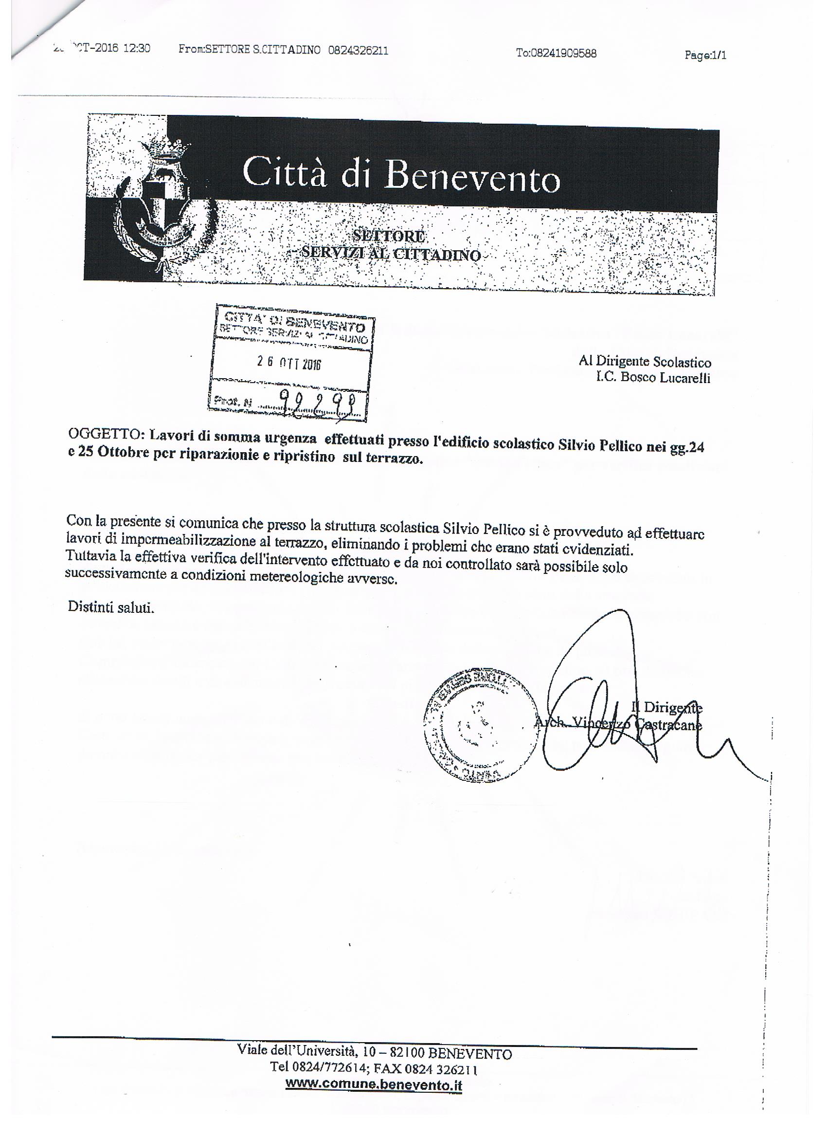 BENEVENTO – Con il comunicato del 21 ottobre 2016, l’associazione Io X Benevento segnalava l’accumulo di acqua piovana sul terrazzo del plesso scolastico “Silvio Pellico” e il conseguente pericolo di infiltrazioni d’acqua. “La Dirigente scolastica, la dott.ssa Annamaria Morante”, si legge nella nota stampa dell’associazione, “ha trasmesso una nota con la quale il Comune di Benevento, assicurava di aver effettuato lavori di ripristino e riparazione del terrazzo nei giorni 24 e 25 ottobre 2016.