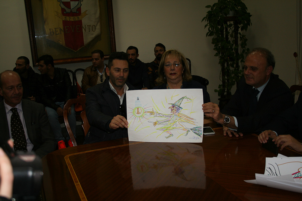 La città si prepara al Natale. E’ stato consegnato questo pomeriggio dal maestro Lello Esposito al sindaco di Benevento, Clemente Mastella, il bozzetto raffigurante il logo della manifestazione “Streghe in luce” che prenderà il via all’inizio del mese di dicembre.