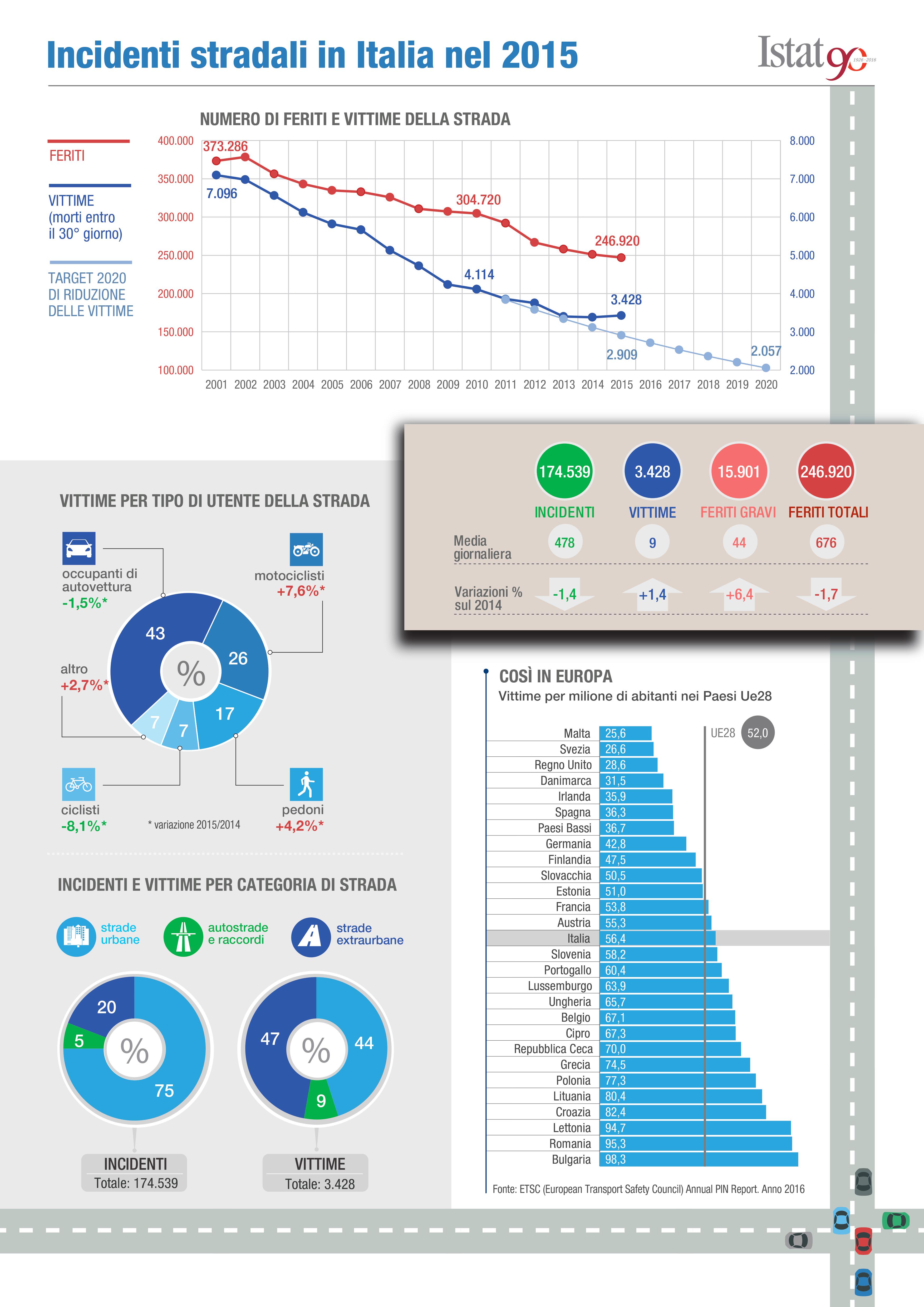Nel 2015, per la prima volta dal 2001, è tornato a crescere (+1,4%) il numero delle vittime, a fronte di una flessione dell’1,4% degli incidenti e dell’1,7% dei feriti.