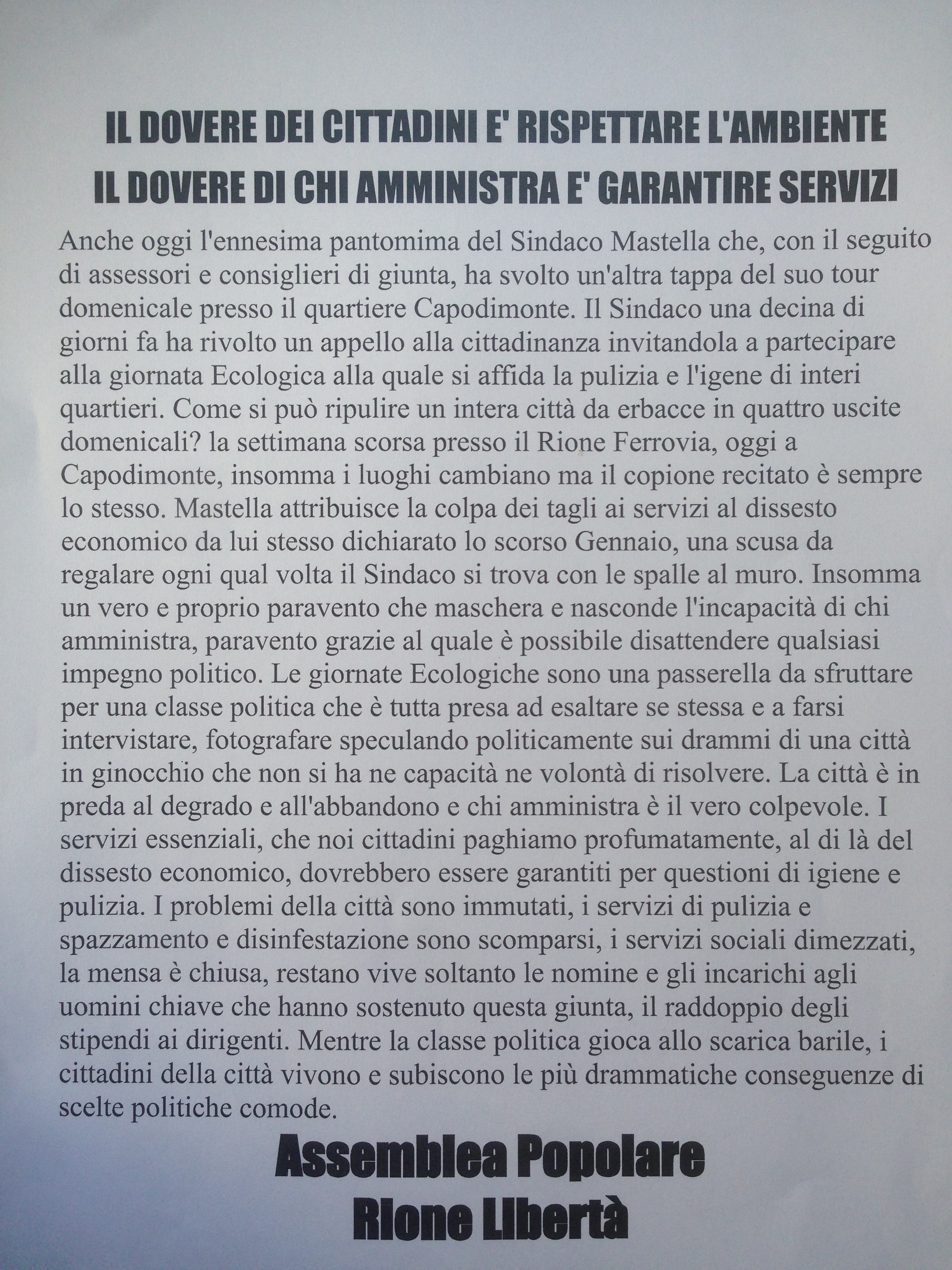 “Questa mattina, insieme agli attivisti dell’Assemblea Popolare del rione Libertà, del Lap Asilo 31, del Comitato di Quartiere del rione Libertà Democrazia – Legalità e Libertà, e della nostra Associazione, abbiamo provveduto a diffondere una comunicazione ai Cittadini del Rione Capodimonte con lo scopo di declinare una questione imbarazzante che rientra nel costume partitico dei politicanti della prima Repubblica. La Città di Benevento ha bisogno di servizi, i Cittadini onorano tariffe tra le più onerose d’Italia e il Sindaco deve chiarire il proprio ruolo, deve dire alla Città se si è candidato per fare il presidente della Pro-loco organizzando feste e passerelle, se voler essere un volontario di un’associazione o fare l’Amministratore, il Sindaco e, quindi, occuparsi di risolvere i problemi che attanagliano la Città con gli strumenti istituzionali.