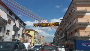 Qui siamo a via Cocchia già addobbata ma con sobrietà. Palloncini gialli e rossi sovrastano il ponte Vanvitelli e il viale Principe di Napoli fino alla stazione. Non mancano i manifesti a lutto con la vittima predestinata che è il Carpi. Insomma la gente attende quasi con incredulità e spera di esplodere al triplice fischio dell’arbitro Pasqua della sezione di Tivoli. E noi con loro.