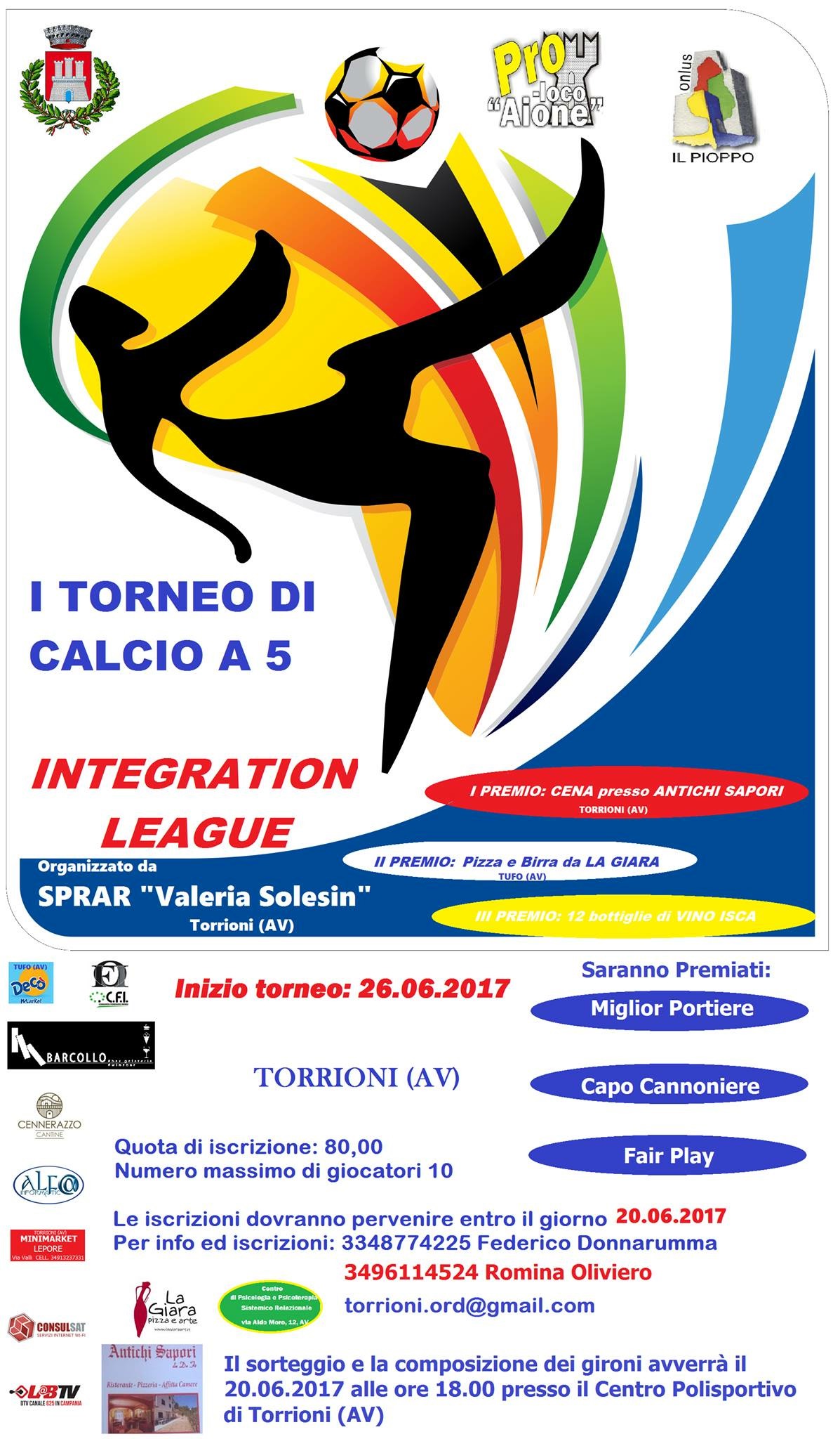 La chiusura di questo giugno all’insegna dell’integrazione è fissata per lunedì 26 con il fischio d’inizio del torneo di calcio a 5 denominato “Integration League”. Ricordiamo alla cittadinanza e a chiunque volesse partecipare alla competizione con una propria squadra – senza limiti di età e di nazionalità – che le iscrizioni sono ancora aperte: la quota di partecipazione è 80€, per un numero massimo di 10 giocatori. Le adesioni vanno comunicate, entro il 20 giugno, a Federico Donnarumma al numero 334.87.74.225 e a Romina Oliviero 3496114524