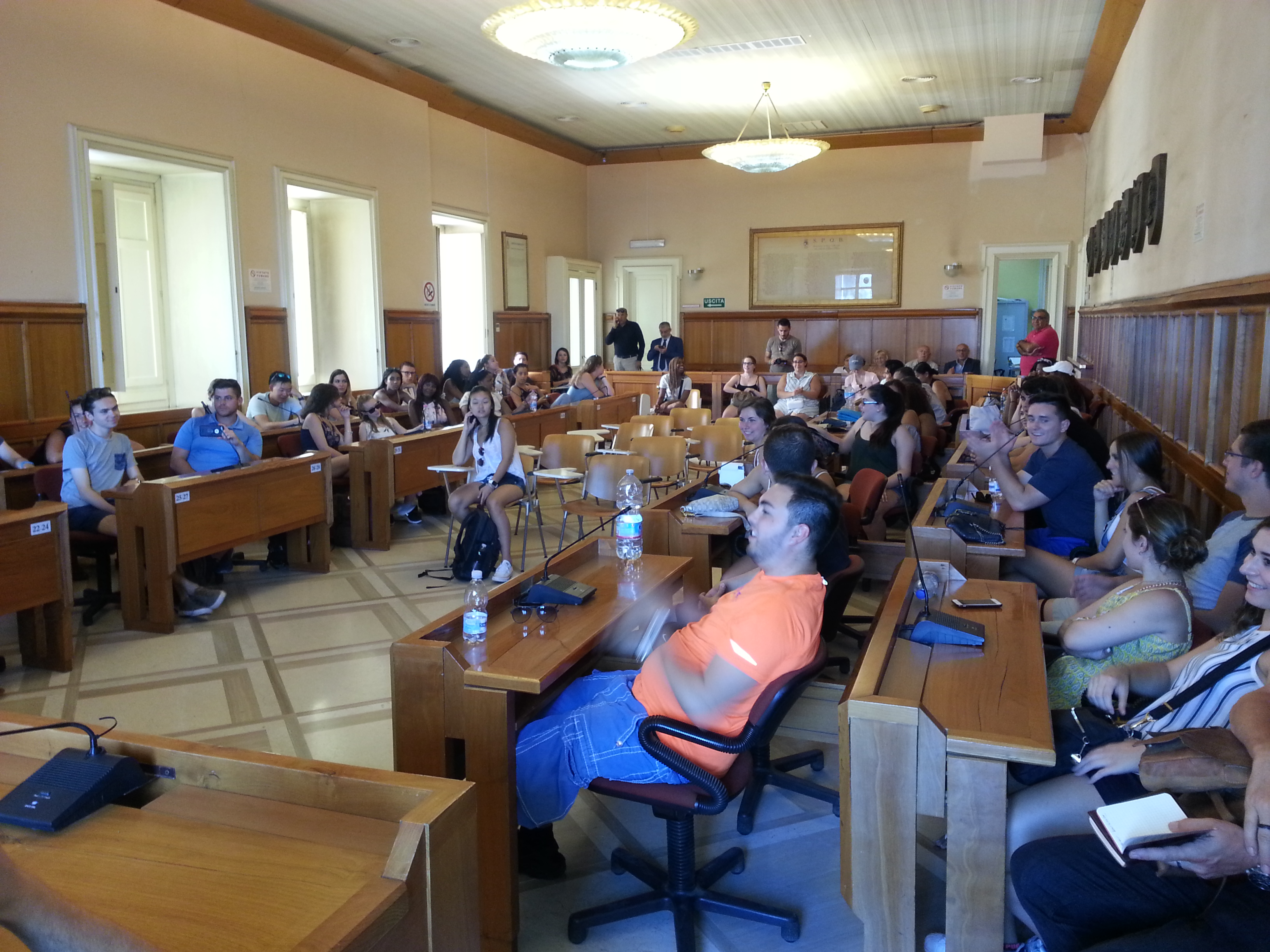 Un’autentica invasione, ma una di quelle che fa piacere, senza dubbio. L’aula consiliare di Palazzo Mosti si è riempita, questa mattina, di una moltitudine di ragazzi americani studenti della State University of New York at Stony Brook, meglio nota come Stony Brook University, una delle più prestigiose università pubbliche degli Stati Uniti. Direttamente dal Long Island nella nostra città dove l’allegra brigata, composta da studenti e dai loro docenti, ha potuto ammirare le vestigia dei grandi monumenti, Arco Traiano, Santa Sofia e via così. Tappa sannita piuttosto che la penisola sorrentina e già questo consola e fa sperare. Ragazzi di tutti i colori del mondo, segno della multietnicità della Grande Mela, un po annoiati per la prammatica visita al Comune, dove ad attenderli c’era il sindaco, scomparso dai radar negli ultimi giorni a causa delle note vicende della sua maggioranza ma poi d’improvviso rimaterializzatosi per accogliere gli ospiti d’oltreoceano. Ai quali ha dispensato o ha tentato di farlo il suo inglese un po arrugginito ma suscitando un urlo da stadio nel momento in cui ha rivelato che proprio originaria di Long Island è la consorte Sandra. Alla fine lo scambio di doni, una cravatta per il sindaco, depliant e pubblicazioni su Benevento per gli ospiti americani che, lasciato Palazzo Mosti, hanno ripreso a girare per la città.