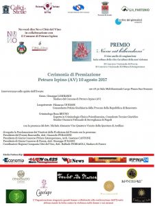 Si concluderà con la presenza dello Stato e le Istituzioni la II edizione del Premio “Nunc est bibendum. Il vino anello di congiunzione tra la coltura della vite e la cultura della non violenza” – II Concorso Nazionale di Pittura Estemporanea e II Concorso Nazionale di Poesia. Giovedì 10 agosto, con inizio alle 18:30, prima della proclamazione dei vincitori dell’Edizione 2017 interverranno sul tema della non violenza sulle donne e sui minori il Luogotenente Filomeno Di Biase Comandante Polizia Giudiziaria della Procura della Repubblica di Benevento e la Criminologa Rosa Bruno, Esperta in Criminologia Clinica Psicodinamica, Consulente Tecnico Giuridico, Giudice Onorario Tribunale di Sorveglianza di Napoli con e alla presenza del dott. Michele Abenante Vice Questore Vicario della Questura di Avellino. A portare i saluti del Comune di Petruro Irpino, il Sindaco Giuseppe Lombardi. Di seguito, il direttore artistico dell’evento, nonché Presidente Nazionale di No vuol dire No, Jenny Capozzi, il Presidente del Premio Bancarella, Giancarlo Perazzini, il Presidente di Giuria Pittura Estemporanea, Gaetano Cantone, il Presidente di Giuria Poesia, Giuseppe Iuliano e del Coordinatore Regione Campania Città del Vino, Raffaele Ferraioli, nonché Sindaco di Furore, proclameranno i dieci vincitori. I lavori saranno moderati dalla giornalista Barbara Ciarcia de Il Mattino. Presenti anche i direttori delle testate giornalistiche con cui si è condivisa la media partnership: Massimiliano Finamore di Tg News Tv,  Antonella Oliviero di LabTV, Alfredo Picariello di +Economia e gli organi di informazione Sannio Teatri e Culture di Elide Apice e Irpinia24 con la direzione di Melina Marena.