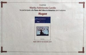 In occasione della fiera “Book Expo America” che si è svolta a New York, dal 30 maggio al 2 giugno 2017, presso il Javits Center ha avuto l’onore di essere presente la silloge poetica “Nugae”, edito dalla casa editrice Aletti (RM), dell’autrice beneventana Marika Addolorata Carolla. Gli Stati Uniti rappresentano il maggiore mercato editoriale a livello mondiale. Al termine della manifestazione il libro è stato consegnato al famoso Istituto Italiano di Cultura. Per la giovane autrice una notevole soddisfazione, che ha portato un po’ di Sannio negli USA.