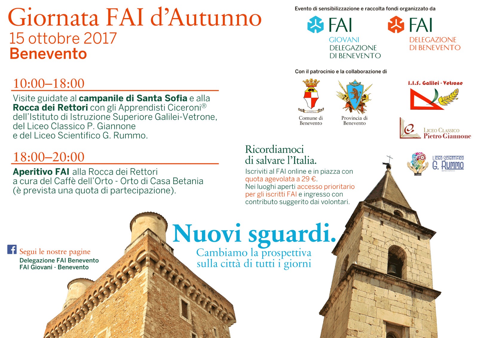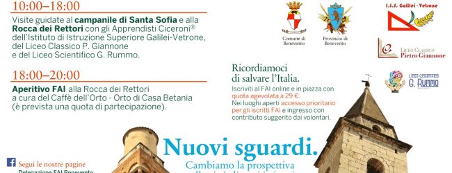 Il 15 ottobre a Benevento la Giornata FAI d’Autunno. Visite guidate al campanile di Santa Sofia e alla Rocca dei Rettori con gli Apprendisti Ciceroni dell’Istituto di Istruzione Superiore Galilei-Vetrone, del Liceo Classico P.Giannone e del Liceo Scientifico G.Rummo. Le visite guidate sono in programma dalle ore 10.00 alle ore 18.00. Dalle 18.00 fino alle 20.00 è in programma l’Aperitivo Fai, nella splendida location del terrazzo della Rocca a cura del Caffè dell’Orto -Orto di Casa Betania.