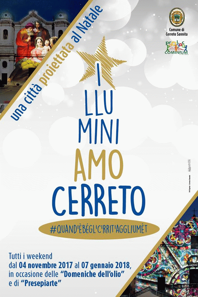 Siamo a Cerreto Sannita, uno dei comuni più belli della provincia di Benevento, dove storia e arte si fondono con la tradizione agroalimentare legata all’olio e alle creazioni in ceramica,famose in tutto il mondo. Un lunga scia di eventi ci porta verso il Natale, come un tappeto rosso su cui camminare e ammirare le bellezze del luogo impreziosite dalle luminarie. “IlluminiAmo Cerreto” è la prima edizione di una grande festa che celebra la bellezza del luogo, le sue tradizioni e le sue eccellenze, e racchiude altre due manifestazioni che rappresentano il territorio,” IlluminiAmo Cerreto” è la festa della luce, che prevede la speciale illuminazione delle Chiese di Cerreto, con proiezioni prettamente natalizie.L’evento è ideato dal Comune di Cerreto Sannita, in collaborazione con La ProLoco Cominium, la APTC, il Forum Giovani Cerreto e la Società operaia di Cerreto Sannita e si tiene dal 4 novembre 2017 al 7 gennaio 2018.