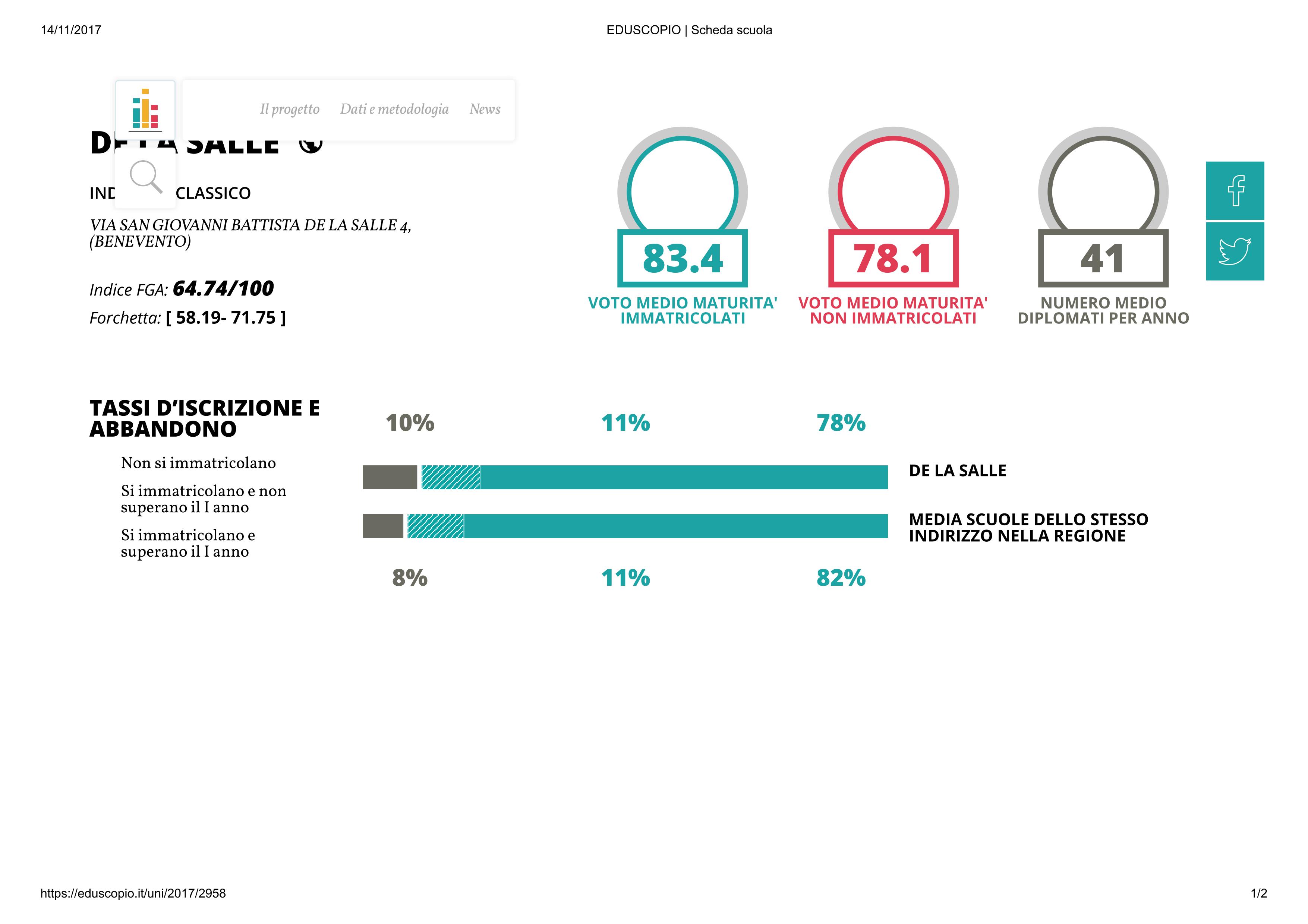 Nella classifica che riguarda le province di Benevento e Avellino l’Istituto Paritario “De La Salle” si è posizionata al terzo posto con una media punti di 64,74. (vedi allegato e link https://eduscopio.it/uni/2017/2958 https://eduscopio.it/percorso-genitori-scelta-scuola-superiore#table-slide ). L’Istituto “De La Salle” conferma, dunque, la propria lunga tradizione educativa sul territorio beneventano grazie ad un percorso inserito nell’ambito del Seminario Arcivescovile. Un vero e proprio successo per l’istituto sannita che nei giorni scorsi è stato accolto con grande soddisfazione dal dirigente scolastico Raffaella Iacovelli.