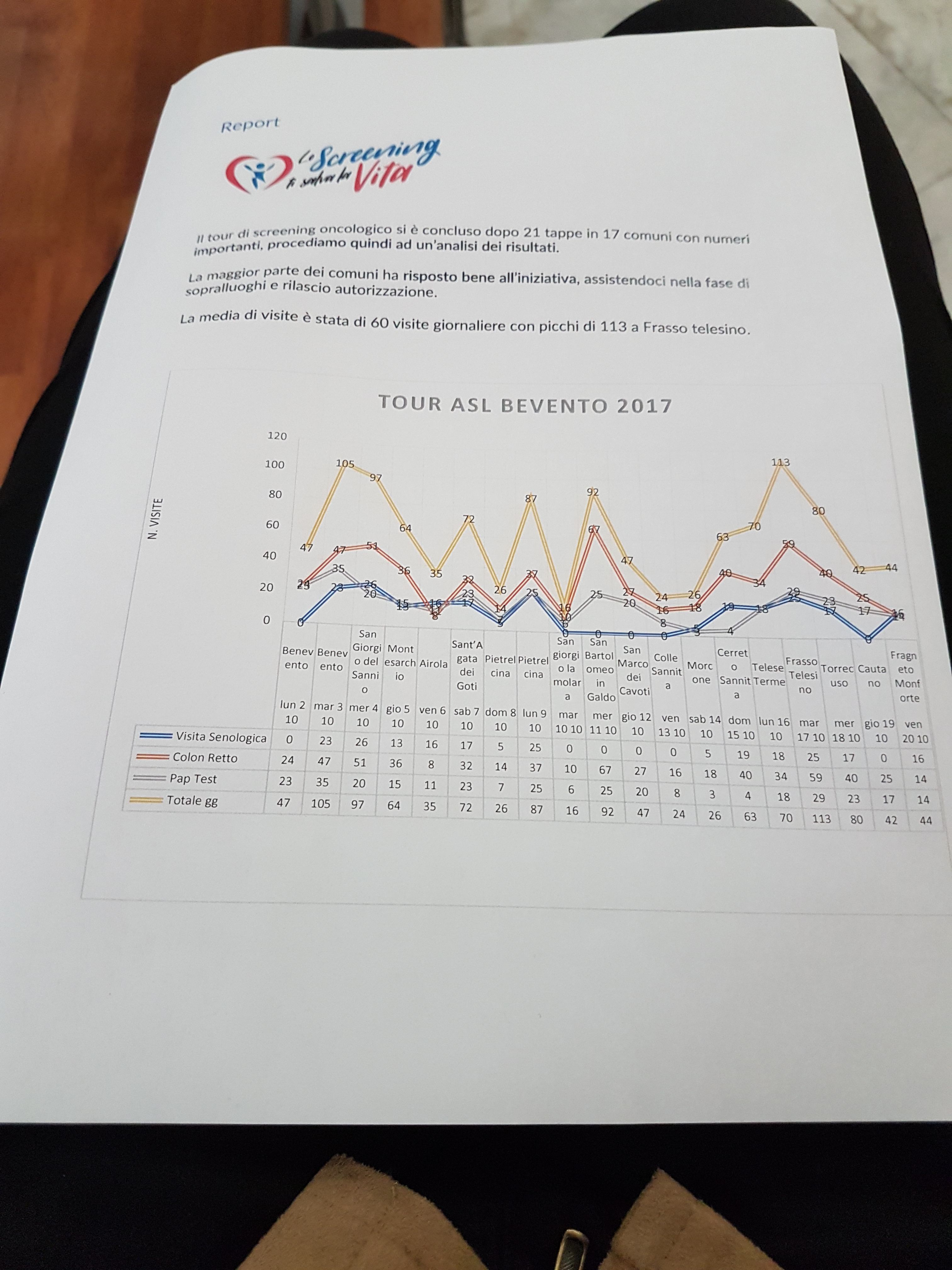 21 tappe in 17 comuni e 60 visite giornaliere. Questi alcuni numeri de “Lo screening ti salva la vita”. Ad illustrare il report sulla campagna di prevenzione gratuita del cancro all’utero, mammella e colon retto partita ad ottobre, il Direttore sanitario, dell’ASL di Benevento Vincenzo D’Alterio e il Direttore generale dell’Azienda sanitaria locale Franklin Picker. Educare i cittadini alla prevenzione e alle politiche di screening che consentono le diagnosi precoci, questo l’obiettivo del tour targato Asl di Benevento. L’ ambulatorio mobile, con a bordo i medici specialisti, ha girato nei comuni della provincia con un unico obiettivo: quello della salvaguardia. Il tour verrà ripetuto nella prossima primavera.