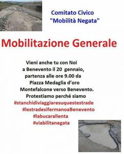Sabato 20 gennaio, con partenza alle ore 9.00 da Piazza Medaglia D’Oro di Montefalcone di Val Fortore, decide di persone giungeranno nel capoluogo per protestare, contro lo stato delle strade provinciali e per la viabilità negata. Nel corso degli ultimi anni, le Amministrazioni Provinciali hanno rimandato i necessari interventi di manutenzione stradale nel nostro Comune e nella Val Fortore e di conseguenza la viabilità locale è ormai ridotta in uno stato drammatico. La popolazione di Montefalcone, e non solo, incontra sempre maggiori difficoltà negli spostamenti e c’è il rischio concreto di restate isolati, non potendo più raggiungere gli indispensabili centri di assistenza sanitaria, le scuole e i pubblici Uffici, a causa dei sempre maggiori danneggiamenti delle linee di collegamento stradale. Vogliamo richiamare l’attenzione sulle ‘ragioni’ che rendono necessario un immediato, e non più procrastinabile, intervento sulla viabilità provinciale, sempre più disastrata. La drammatica situazione dello stato di manutenzione delle strade della Provincia di Benevento necessita di una decisa presa di coscienza di tutti gli Enti sovra provinciali. Una situazione ormai insostenibile. Siamo stanchi e arrabbiati, siamo al limite della sopportazione. Le strade che ci collegano alla nostra Provincia, versano in condizioni inaccettabili, tanto da potere essere riclassificate non più come strade provinciali, bensì come “tratturi”. Una situazione emergenziale che vogliamo segnalare con una mobilitazione generale di tutti i cittadini del’alto Fortore, a Sua Eccellenza il Prefetto di Benevento, al Presidente della Regione e al Presidente della Provincia di Benevento, ribadendo “lo stato emergenziale ed il grave rischio per l’incolumità di tutti coloro che giornalmente viaggiano sulle strade provinciali. Le ripetute richieste di un intervento mirato alla sistemazione della viabilità non potrà continuare a rimanere inascoltato. La non manutenzione della viabilità che si protrae da diversi anni, l’assenza totale di interventi ordinari, il mancato ripristino della pavimentazione fanno delle nostre strade dei veri e propri corsi d’acqua che ad ogni pioggia mettono a rischio la vita dei pendolari e di tutti coloro che quotidianamente percorrano queste arterie. Pertanto, il nostro auspicio è che gli Amministratori locali, al di là delle consuete dichiarazioni di intenti, diano davvero attuazione ad un piano strutturale ed organico di manutenzione delle strade della Val Fortore, che possa riguardare, non solo le vie di comunicazione principali, ma l’intera rete stradale, in modo tale da consentire la sopravvivenza del nostro amato territorio”.