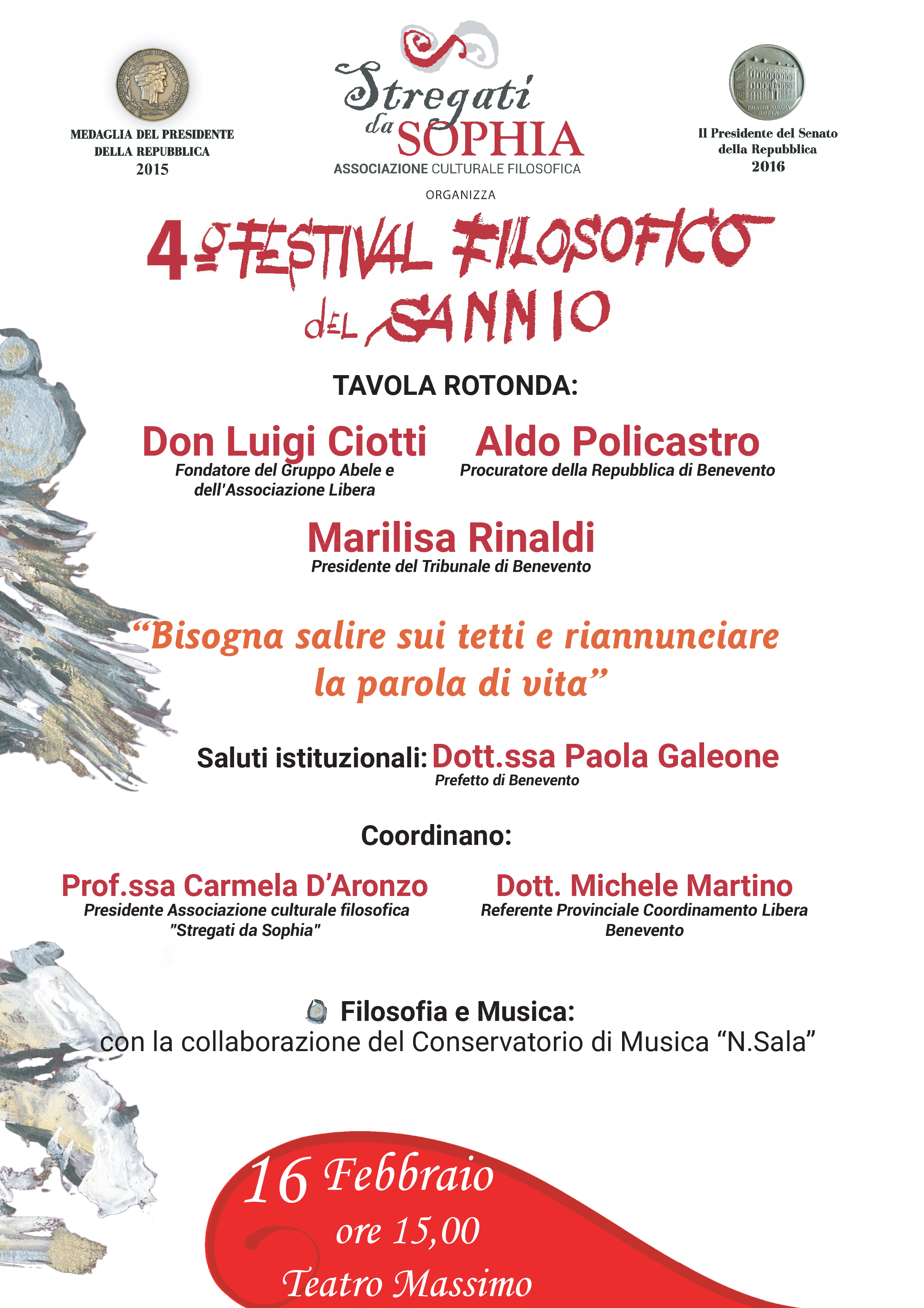 “Bisogna salire sui tetti e riannunciare la parola di vita” questo il tema della IV edizione del Festival Filosofico del Sannio, organizzato dall’Associazione culturale “Stregati da Sophia”. La kermesse culturale che si è tenuta presso il teatro Massimo di Benevento, ha visto la partecipazione di Don Luigi Ciotti (Associazione Libera)il Procuratore della Repubblica di Benevento Aldo Policastro,  e il  Presidente del Tribunale di Benevento,Marilisa Rinaldi.