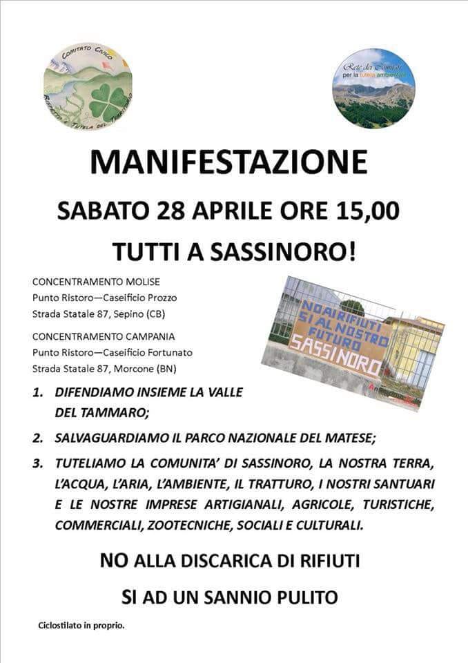 Domani 28 aprile Sassinoro scende in piazza, e lo fa insieme al Comitato Civico “Rispetto e tutela del territorio” “Rete dei Comitati per la tutela ambientale”,ai cittadini e sindaci dei comuni limitrofi. La protesta per dire no all’installazione di un impianto di compostaggio nell’area industriale, partirà da due punti, nel territorio campano a Morcone (Bn), e in quello molisano, a Sepino (Cb) per raggiungere attraverso la statale 87 il presidio permanente H24. La partenza del corteo è prevista per le ore 15.00.