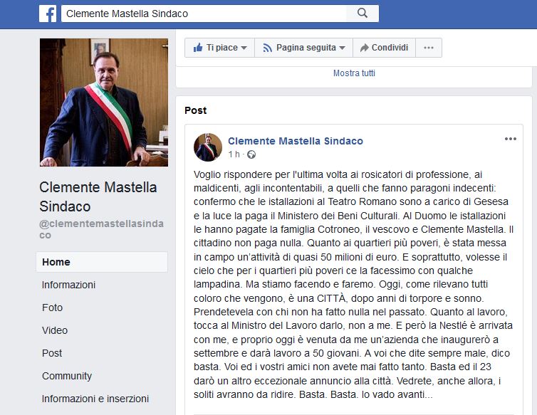 “Voglio rispondere per l’ultima volta ai rosicatori di professione, ai maldicenti, agli incontentabili, a quelli che fanno paragoni indecenti: confermo che le istallazioni al Teatro Romano sono a carico di Gesesa e la luce la paga il Ministero dei Beni Culturali. Al Duomo le istallazioni le hanno pagate la famiglia Cotroneo, il vescovo e Clemente Mastella. Il cittadino non paga nulla. Quanto ai quartieri più poveri, è stata messa in campo un’attività di quasi 50 milioni di euro. E soprattutto, volesse il cielo che per i quartieri più poveri ce la facessimo con qualche lampadina. Ma stiamo facendo e faremo. Oggi, come rilevano tutti coloro che vengono, è una CITTÀ, dopo anni di torpore e sonno. Prendetevela con chi non ha fatto nulla nel passato. Quanto al lavoro, tocca al Ministro del Lavoro darlo, non a me. E però la Nestlé è arrivata con me, e proprio oggi è venuta da me un’azienda che inaugurerò a settembre e darà lavoro a 50 giovani. A voi che dite sempre male, dico basta. Voi ed i vostri amici non avete mai fatto tanto. Basta ed il 23 darò un altro eccezionale annuncio alla città. Vedrete, anche allora, i soliti avranno da ridire. Basta. Basta. Io vado avanti…