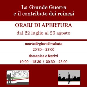 Il 22 luglio presso l’Edificio Mons. Jadanza locali espositivi, sarà inaugurata una interessante mostra”La Grande Guerra e il contributo dei Reinesi” . L’11 agosto invece sarà la volta dell’intitolazione al Soldato Domenico Tozzi, della Terrazza sovrastante il centro di Aggregazione e il Convegno “La grande Guerra che cambiò il mondo”. Il centenario vede tanti momenti interessanti e di grande intensità, come il concerto del 16 agosto a cura  del Coro Polifonico Terrae Reginae Cantores.
