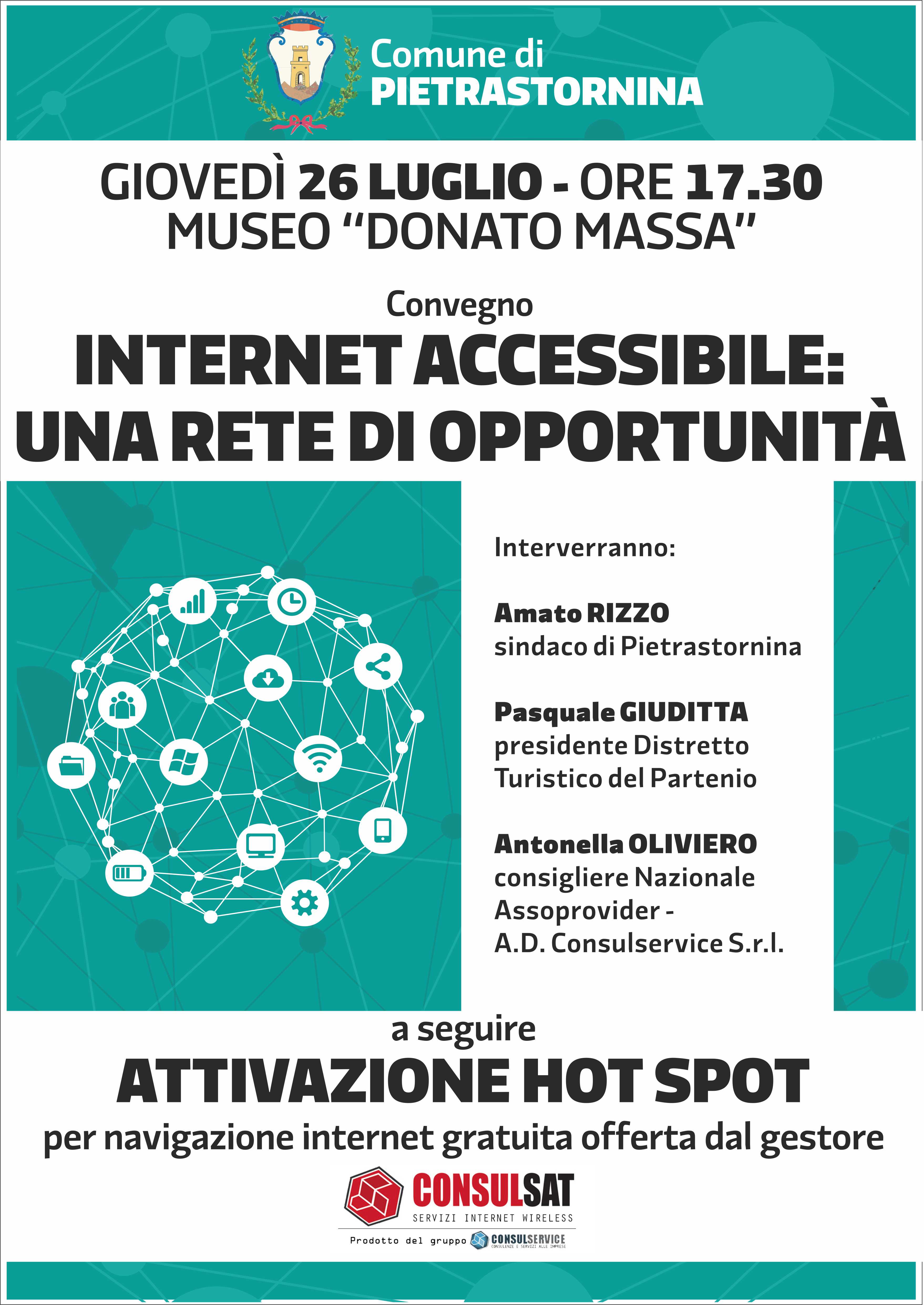 L’Amministrazione Comunale di Pietrastornina, il giorno 26 luglio alle ore 17.30, attiverà il primo dei punti c.d. “hot spot” per la fruizione gratuita di internet per i cittadini. A fare da cornice a tale appuntamento sarà il convegno dal titolo “Internet Accessibile: una rete di opportunità”. Si discuterà delle importanti possibilità che la rete offre, in particolare, in termini sociali e anche dal punto di vista turistico. Dopo i saluti istituzionali e l’introduzione del Sindaco di Pietrastornina, Amato Rizzo, interverranno il Presidente del Distretto Turistico del Partenio, Pasquale Giuditta, e la consigliera nazionale di Assoprovider, Antonella Oliviero. Al termine del convegno sarà ufficialmente attivata la prima area “wi-fi free” del comune, nata dalla sinergia tra il gestore telefonico-servizi internet “Consulsat” e l’Amministrazione Comunale. L’intento è quello di offrire ai cittadini e a chi sosterà a Pietrastornina un servizio che si sta diffondendo sempre più in tutto il mondo. “L’importanza di mettere a disposizione tale servizio – dichiara il Sindaco di Pietrastornina, Amato Rizzo – è una grande occasione per tutti gli utenti fruitori di poter restare online sia per lavoro che per svago. Abbiamo partecipato alla CALL della Comunità Europea <<WiFi4Eu>> per la quale siamo in attesa dei risultati. Con questo primo punto di accesso ad internet che inauguriamo giovedì prossimo, intendiamo puntare ad una inclusione digitale strutturale e per tutti”. Internet accessibile tramite gli hot spot rappresenta un valore aggiunto per una comunità che vuole guardare all’Europa. Aumenta l’efficacia di comunicazione dei portali istituzionali, con possibilità di accesso ai servizi informativi connessi, appunto, alle Istituzioni, al turismo e al sociale, fruibili attraverso l’uso dei dispositivi, oggi, di maggiore diffusione: smartphone, tablet e tutti gli altri dispositivi mobili. “Credo che stiamo viaggiando in una buona direzione. Le infrastrutture messe a disposizione da Consulsat, a cui va il mio ringraziamento – prosegue il Sindaco Rizzo – consentiranno, inoltre, di abbattere il divario digitale“.