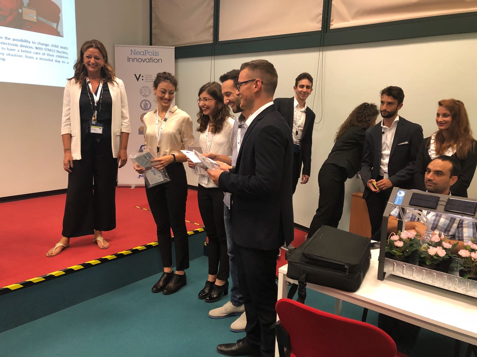 In particolare il gruppo SecuryTeam, composto da Maria Pia Del Rosso e Francesco Mauro dell’Università degli Studi del Sannio, Domenico Rega e Elisa Bellacosa dell’Università degli Studi di Salerno, ha ricevuto uno dei tre premi assegnati ai progetti di gruppo: la “menzione speciale NeaPolis Innovation HackFest 2018”, per il progetto “Baby On Board”, come miglior prodotto commerciabile. Il seggiolino intelligente progettato dai giovani inventori è dotato di un dispositivo applicabile a qualunque seggiolino in grado di ricordare ad un guidatore distratto la presenza del piccolo lasciato a bordo inavvertitamente.