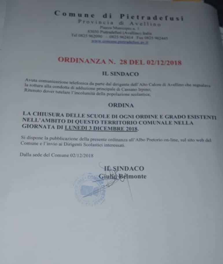 Il Sindaco di Pietradefusi, a seguito del guasto che ha interessato una delle principali condotte idriche di Cassano Irpino, gestite dall’Alto Calore Servizi, ha emanato un’ordinanza, che prevede la chiusura delle scuole di ogni ordine e grado presenti nel territorio comunale per domani lunedì 3 dicembre. Tale provvedimento è stato ritenuto indispensabile per tutelare l’incolumità della popolazione scolastica.