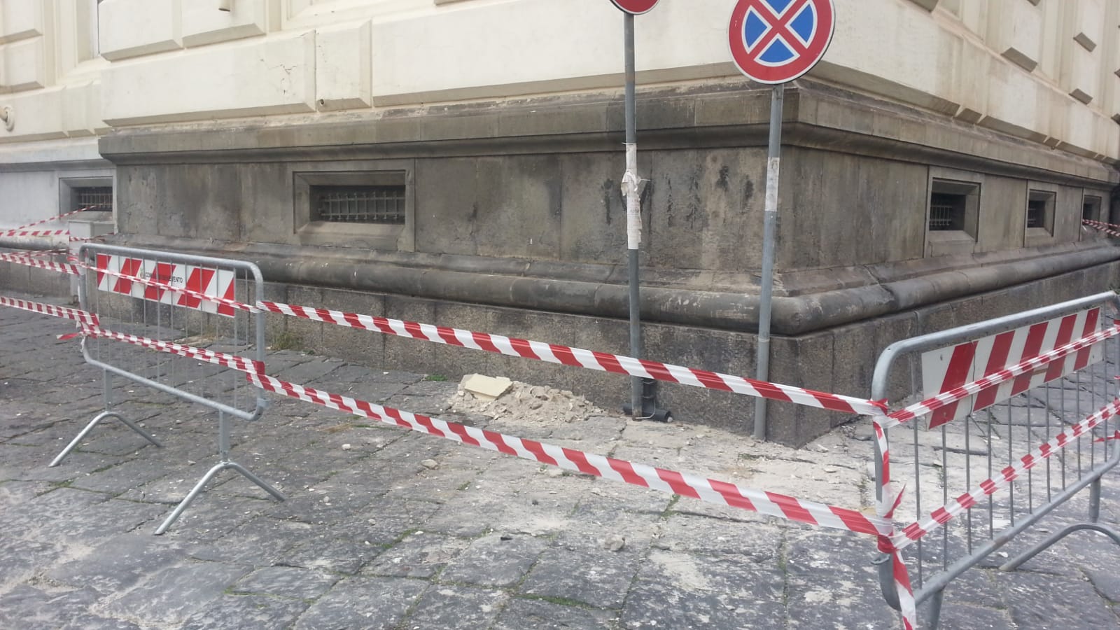I pezzi di cornicione staccatisi dal sottotetto della prefettura di Benevento lo scorso 6 dicembre. A dIstanza di un mese o poco più, parte dei cocci è ancora per terra, delimitata da due transenne. Non vi è traccia di protezione a sostenere il sottotetto da cui si sono staccati i pezzi di intonaco per cui è lecito nutrire qualche perplessità circa la tenuta stessa della parte.