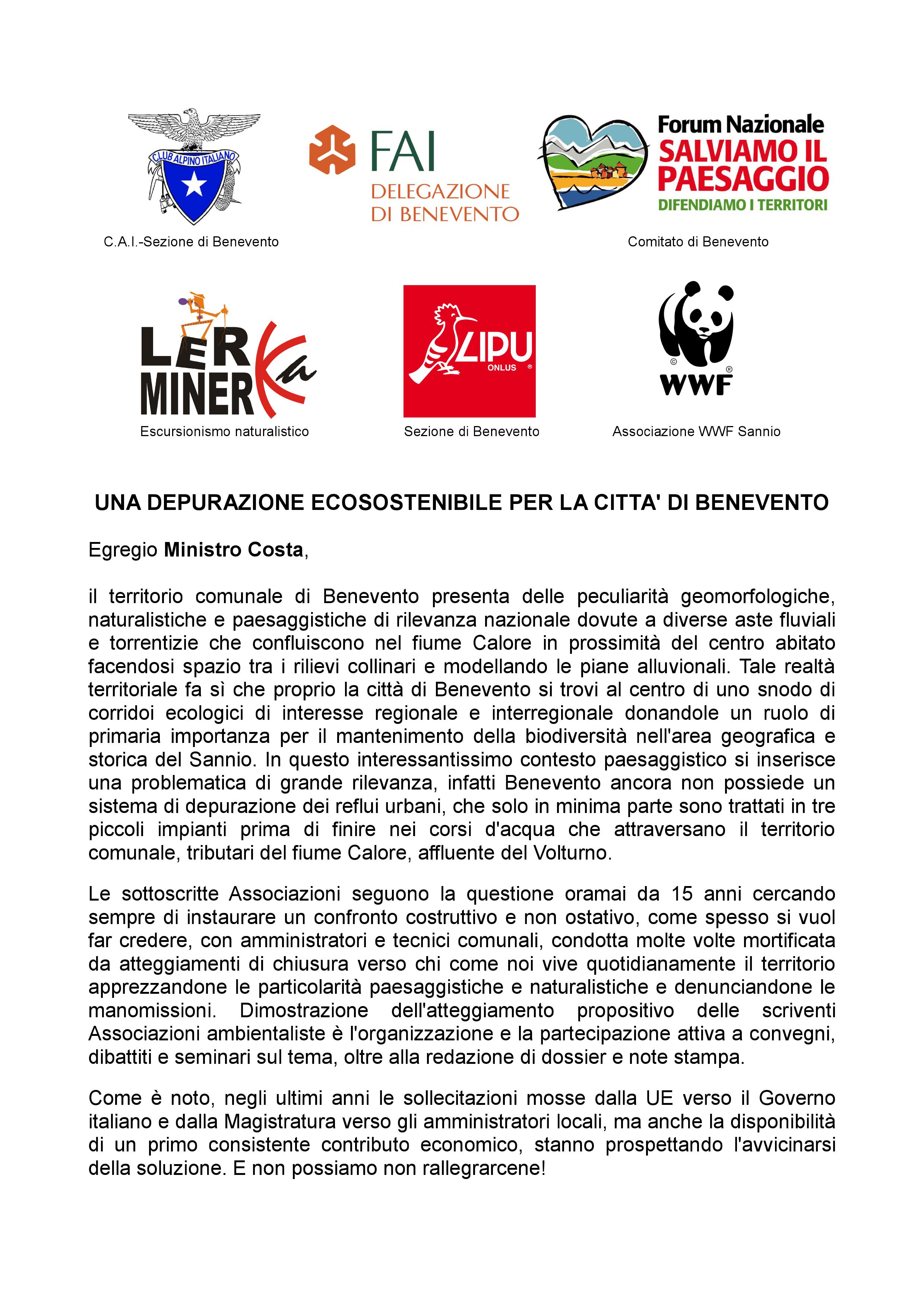 L’incontro è stato proficuo visto l’interesse e la disponibilità del Ministro Costa ad aprire un confronto sulla questione della depurazione delle acque reflue di Benevento, ribadendo e convenendo con le associazioni che tale problematica va risolta ma in maniera appropriata e condivisa. Pertanto le associazioni ambientaliste firmatarie della lettera attendono una convocazione presso il Ministero dell’Ambiente per poter discutere della soluzione del problema con i vari soggetti nazionali e locali coinvolti nella realizzazione dell’importante opera per il futuro di Benevento.