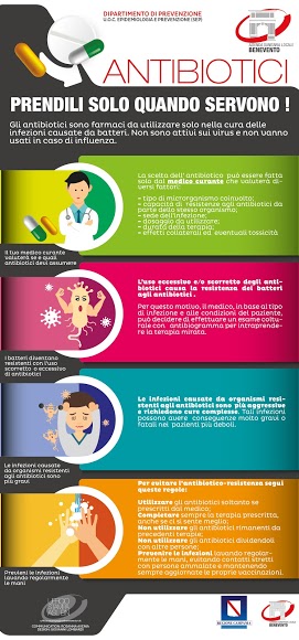 La Asl di Benevento sta promuovendo una campagna informativa per sensibilizzare i cittadini al corretto uso degli antibiotici attraverso locandine e brochure esplicative che sono state distribuite presso tutte le farmacie, le strutture sanitarie dell’Azienda e gli studi dei medici di medicina generale.