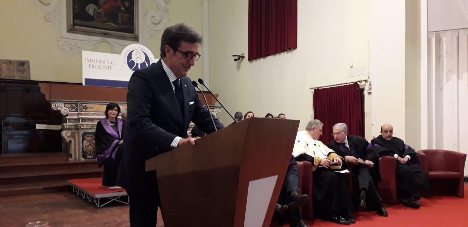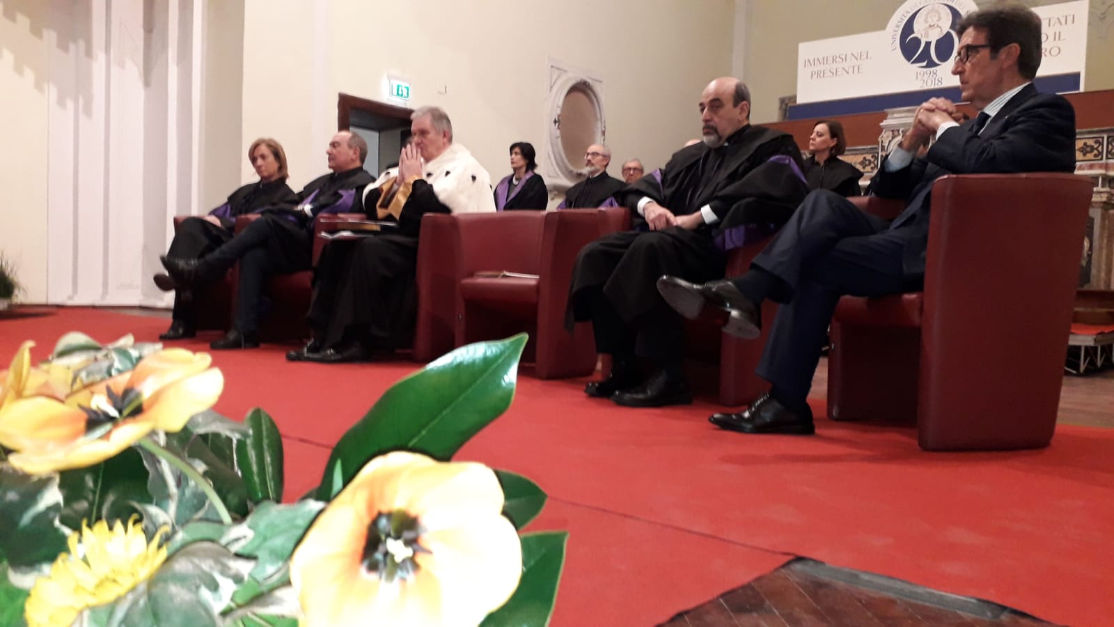 Una cerimonia solenne quella della laurea Honoris causa in Economia e Management targata Unisannio all’enologo di fama mondiale Riccardo Cotarella. Un uomo prima e un imprenditore poi , che si è distinto nello sviluppo di un approccio manageriale e globale, del tutto inedito, nella produzione del vino e che il Sannio oggi ha voluto dare un contributo allo sviluppo del settore vitivinicolo del Sannio. Un parterre d’eccezione quello dell’Auditorium Sant’Agostino di Benevento, autorità civili, militari e politiche di una intera provincia, che si è voluta stringere intorno all’enologo e che ha voluto partecipare dapprima alla lectio magistralis di Cotarella e poi al conferimento della onoreficenza. Tre gli ospiti d’eccezione a testimoniare il contributo di Riccardo Cotarella all’enologia italiana, i giornalisti Bruno Vespa e Luciano Pignataro e il presidente de La Guardiense Domizio Pigna,azienda sannita di cui Cotarella è consulente e di Bruno Vespa che con l’enologo umbro produce vino in Puglia.Emozionato Cotarella ai microfoni dopo la cerimonia ha parlato di “sorgente” per i vitivincoltori del Sannio.