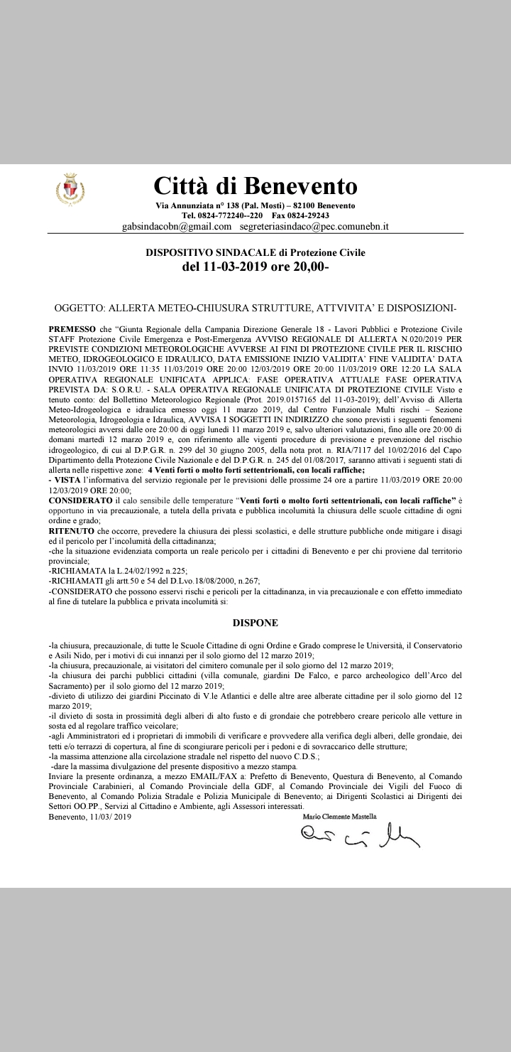 “Forte vento,domani chiudo le scuole potrebbe essere pericoloso”.Il sindaco Mastella chiude domani le scuole a causa del forte vento e lo annuncia sul suo profilo Facebook.Per la gioia dei più piccoli.Ora si attende l’ordinanza sindacale.
