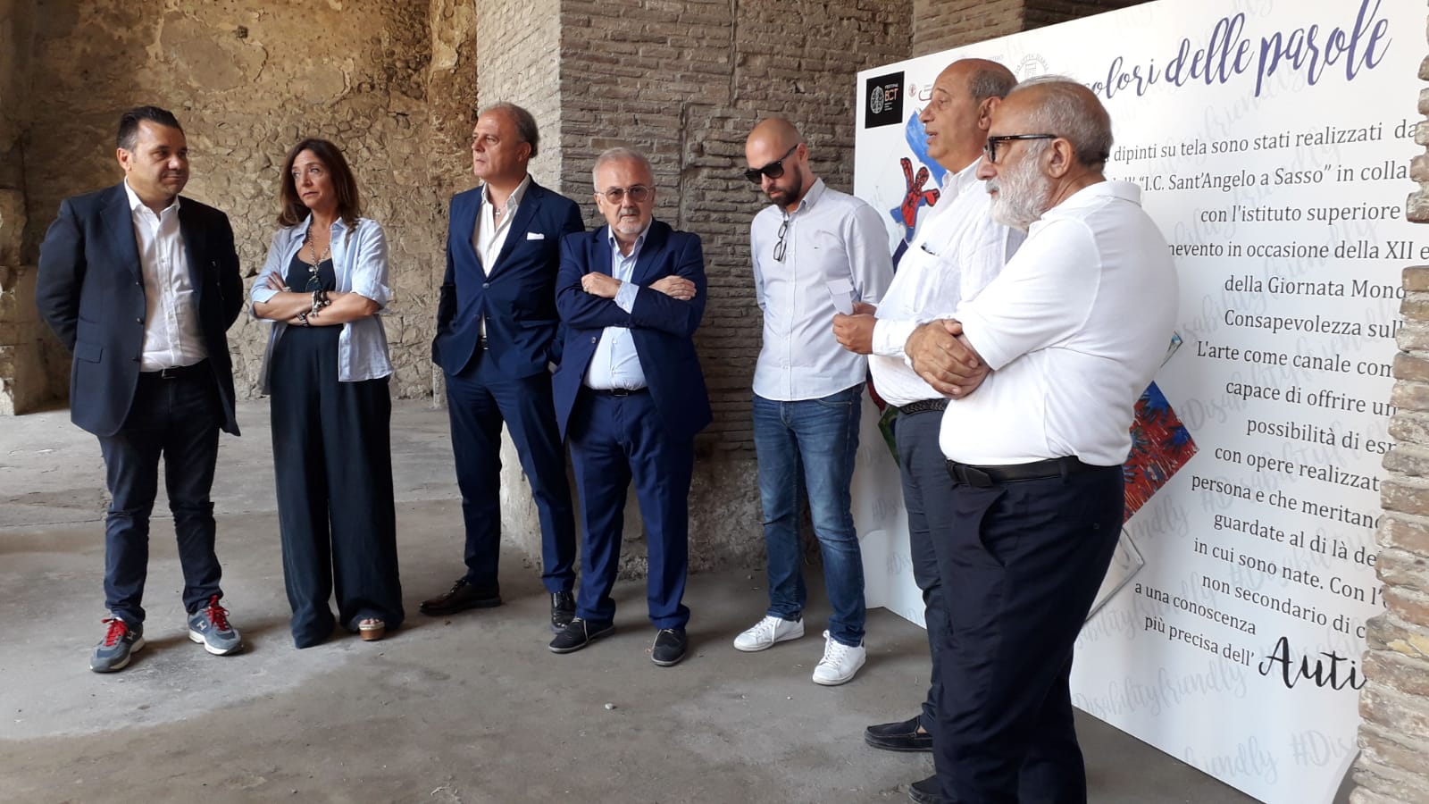 Nella suggestiva cornice del Teatro Romano di Benevento la conferenza stampa di consegna delle vetrofanie #Disabilityfriendly2019 al Direttore artistico del BCT, Antonio Frascadore al Presidente della Camera di Commercio Antonio Campesee al Direttore dell’area Archeologica del Teatro Romano Ferdinando Creta..Il grande contenitore del disabilityfriendly, si arricchisce man mano di iniziative che vedono al proprio fianco collaborazioni istituzionali e non, uniti ognuno per le specifich ecompetenze, nel far proprio l’obiettivo dell’inclusione sociale L’obiettivo dell’inziiativa organizzata dall’Istituto Sant’Angelo a Sasso in collaborazione con il liceo Virgilio di Benevento, il Bct e Camera di Commercio è quello di riuscire a passare dalla cultura dell’handicap a quella della normalità, che afferma la diversità di ogni essere umano come condizione normale, quindi risorsa positiva, patrimonio di cultura, capacità, attitudini, vitalità. Attraverso dei pannelli gli alunni hanno espresso il loro modo di pensare sul concetto di disabilità. Oggi la conclusione del progetto con l’esposizione del pannello esposto al Teatro Romano dei lavori realizzati.