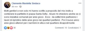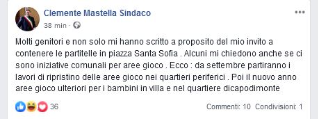 “Molti genitori e non solo mi hanno scritto a proposito del mio invito a contenere le partitelle in piazza Santa Sofia . Alcuni mi chiedono anche se ci sono iniziative comunali per aree gioco . Ecco : da settembre partiranno i lavori di ripristino delle aree gioco nei quartieri periferici . Poi il nuovo anno aree gioco ulteriori per i bambini in villa e nel quartiere di capodimonte”