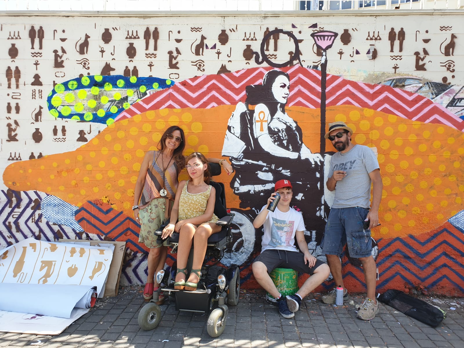 Il tema del murales, è scaturito dalle riflessioni condivise da tutti: La rivisitazione in chiave moderna di Iside, divinità associata alla regalità per essere stata primariamente la personificazione del trono. Il messaggio: un processo di crescita basato sull’incremento della stima di sé, dell’auto-efficacia e dell’autodeterminazione per far emergere risorse latenti e portare l’individuo ad appropriarsi consapevolmente del suo potenziale. Un processo che porta ad un rovesciamento della percezione dei propri limiti in vista del raggiungimento di risultati superiori alle proprie aspettative. Chi meglio di Maria avrebbe potuto rappresentare la divinità? Lei che definisce la sua carrozzella, il suo TRONO. Da questa considerazione nasce l’idea del murales, una rappresentazione simbolica dove si incontrano immagini mentali e parte emotiva.