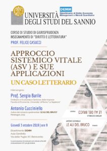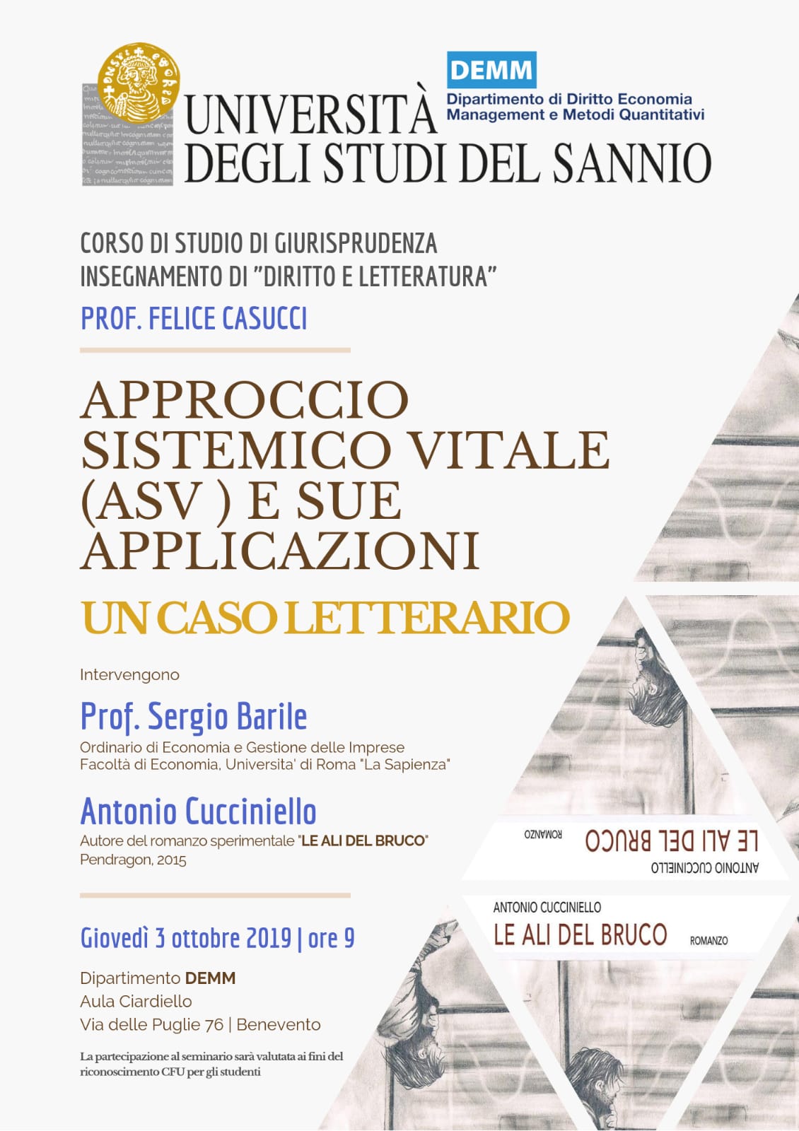 Presso il Dipartimento DEMM, in via delle Puglie a Benevento, giovedì 3 ottobre dalle ore 9.00 si terrà l’incontro su “Diritto e Letteratura”, l’evento culturale sarà tenuto dal prof. Felice Casucci, nell’ambito del Corso di Studi in Giurisprudenza dell’Università degli Studi del Sannio, e vede la partecipazione dello scrittore Antonio Cucciniello e del prof. Sergio Barile, per la presentazione del libro “Le ali del bruco”. Il romanzo è ispirato all’ approccio sistemico vitale, una metodologia di management sviluppata nell’ambito dell’economia d’impresa dall’ ASVA (Associazione per la Ricerca sui Sistemi Vitali), costituita nel 2011 da un gruppo di ricercatori italiani, con lo scopo di approfondire e diffondere gli studi sistemici per la comprensione e la risoluzione di problematiche di carattere sociale ed economico. Il Menagement Sistemico Vitale, focalizza l’ambito più delicato delle decisioni manageriali, chiarendo anzitutto la fondamentale distinzione tra problem solving e decision making e proponendo una rappresentazione del sistema vitale utile a dare evidenza dei delicati meccanismi del processo decisionale in condizione di complessità.