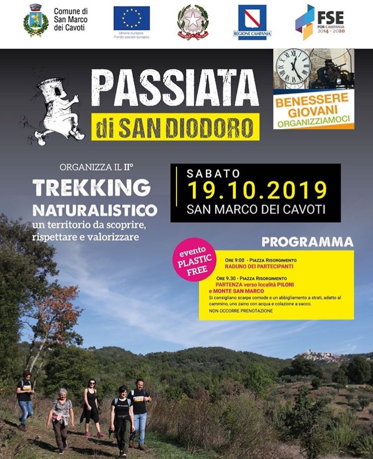 Una giornata all’aria aperta, alla scoperta delle bellezze naturalistiche del paesaggio fortorino,questo e tanto divertimento e relax con la seconda edizione del “Trekking Naturalistico- un territorio da scoprire,rispettare e valorizzare”. L’evento è organizzato nell’ambito del progetto “Benessere Giovani” promosso dalla “Passiata di San Diodoro” ed è in programma sabato 19 ottobre a San Marco dei Cavoti (Bn).Il programma prevede il raduno dei partecipanti alle ore 9.00 in piazza Risorgimento e la partenza fissata alle 9.30 per raggiungere la località Piloni e Monte San Marco. La manifestazione si inserisce nel contesto della giornata organizzata dal CAI Benevento “Ricordando Diodoro” in memoria del prof. Diodoro Cocca. Per partecipare è sufficiente presentarsi al raduno in Piazza Risorgimento a San Marco dei Cavoti, muniti di zainetto con il necessario per una merenda all’aperto, scarpe da ginnastica e tanta voglia di immergersi nella natura.