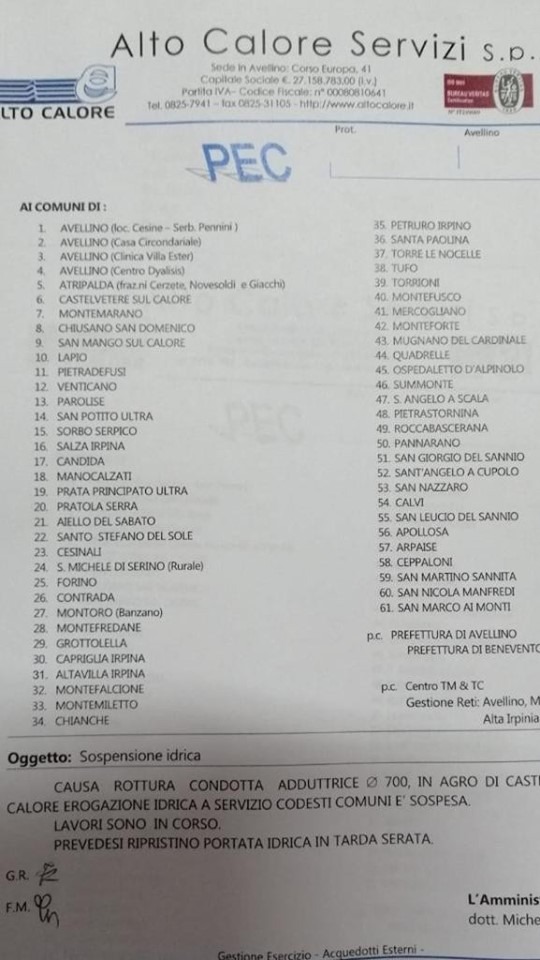 Alto Calore comunica, a causa di un guasto, la sospensione dell’erogazione idrica in diversi comuni di Irpinia e Sannio