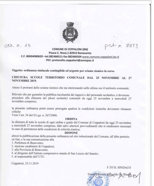 Il sindaco del Comune di ceppaloni, a causa del protarsi dello sciame sismico che sta interessando nelle ultime ore il territorio comunale ordina la chiusura di tutte le scuole, di ogni ordine e grado, al fine di garantire la pubblica incolumità dei ragazi e del personale scolastico.