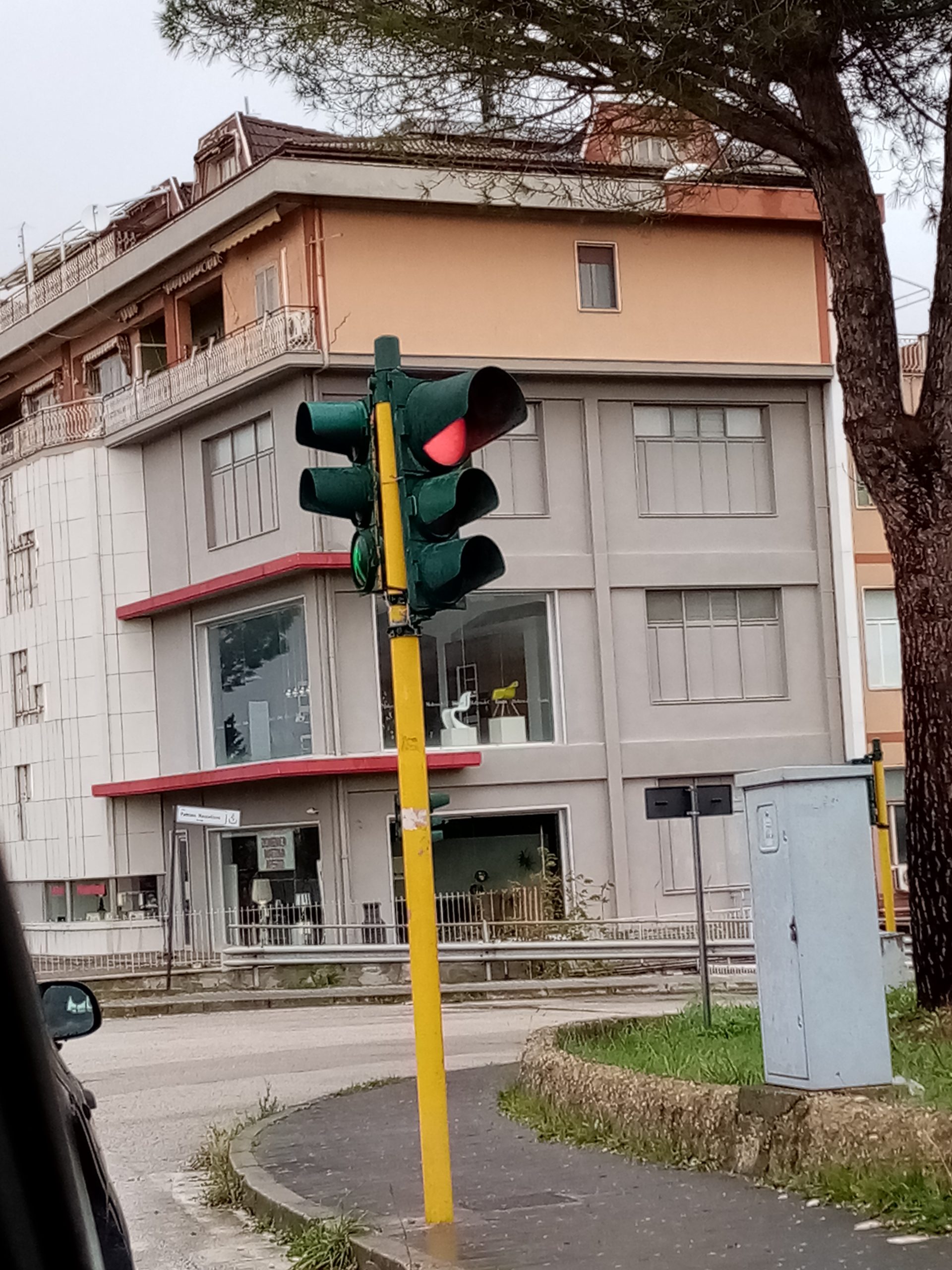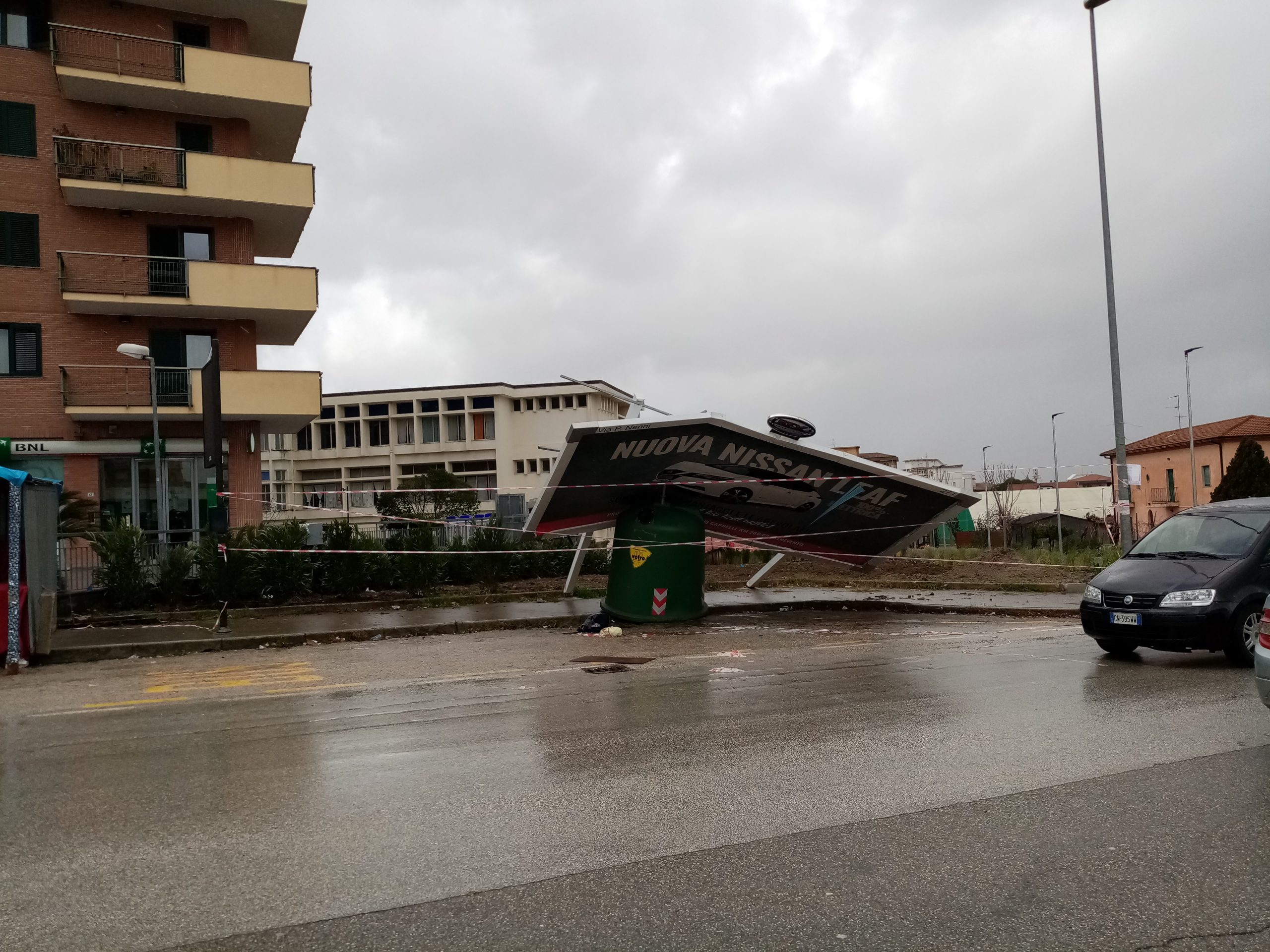 Danni anche al semaforo di via Nenni. LE FORTI RAFFICHE DI VENTO HANNO SPOSTATO DI QUALCHE CENTIMETRO LA STRUTTURA.