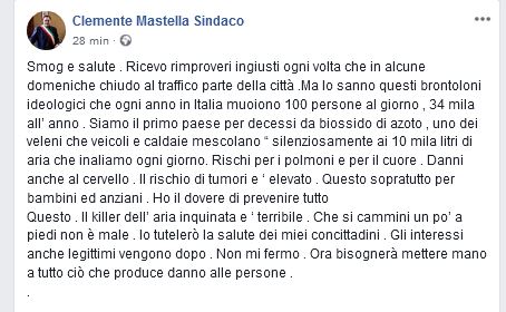 “Smog e salute. Ricevo rimproveri ingiusti ogni volta che in alcune domeniche chiudo al traffico parte della città .Ma lo sanno questi brontoloni ideologici che ogni anno in Italia muoiono 100 persone al giorno , 34 mila all’ anno . Siamo il primo paese per decessi da biossido di azoto , uno dei veleni che veicoli e caldaie mescolano “ silenziosamente ai 10 mila litri di aria che inaliamo ogni giorno. Rischi per i polmoni e per il cuore . Danni anche al cervello . Il rischio di tumori e ‘ elevato . Questo sopratutto per bambini ed anziani . Ho il dovere di prevenire tutto questo . Il killer dell’ aria inquinata e ‘ terribile . Che si cammini un po’ a piedi non è male . Io tutelerò la salute dei miei concittadini . Gli interessi anche legittimi vengono dopo . Non mi fermo . Ora bisognerà mettere mano a tutto ciò che produce danno alle persone .”Questo il post apparso sul profilo facebook del sindaco Mastella.