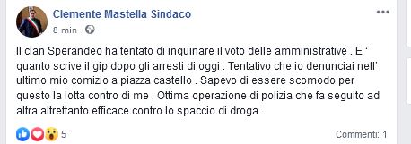 “Il clan Sperandeo ha tentato di inquinare il voto delle amministrative . E ‘ quanto scrive il gip dopo gli arresti di oggi . Tentativo che io denunciai nell’ ultimo mio comizio a Piazza Castello . Sapevo di essere scomodo per questo la lotta contro di me . Ottima operazione di polizia che fa seguito ad altra altrettanto efficace contro lo spaccio di droga”.Cosi il sindaco Mastella sul suo profilo facebook comenta la vasta operazione della DDA di Napoli di questa mattina.