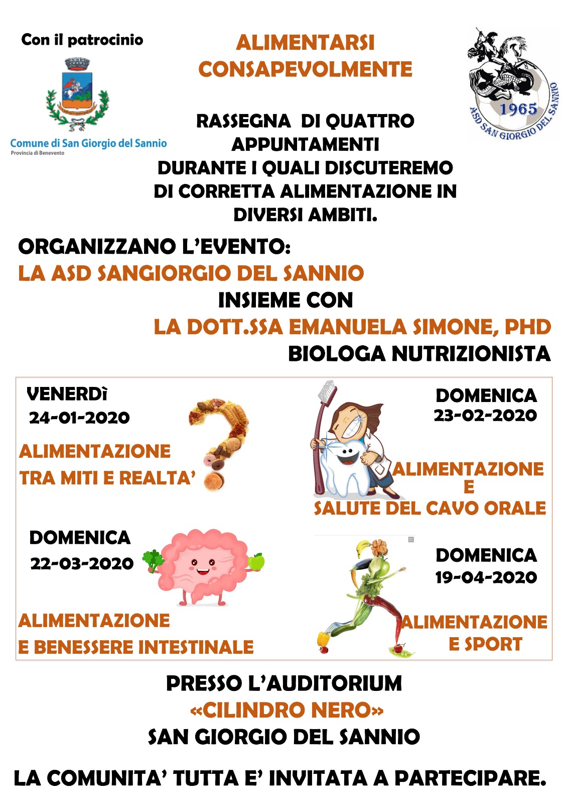 “Alimentarsi consapevolmente” è la rassegna di 4 appuntamenti a cadenza mensile nata dalla collaborazione tra la Dott.ssa Emanuela Simone, biologa nutrizionista e Gianluca Boniello, presidente della ASD San Giorgio, come esigenza alla crescente disinformazione in ambito nutrizionale.