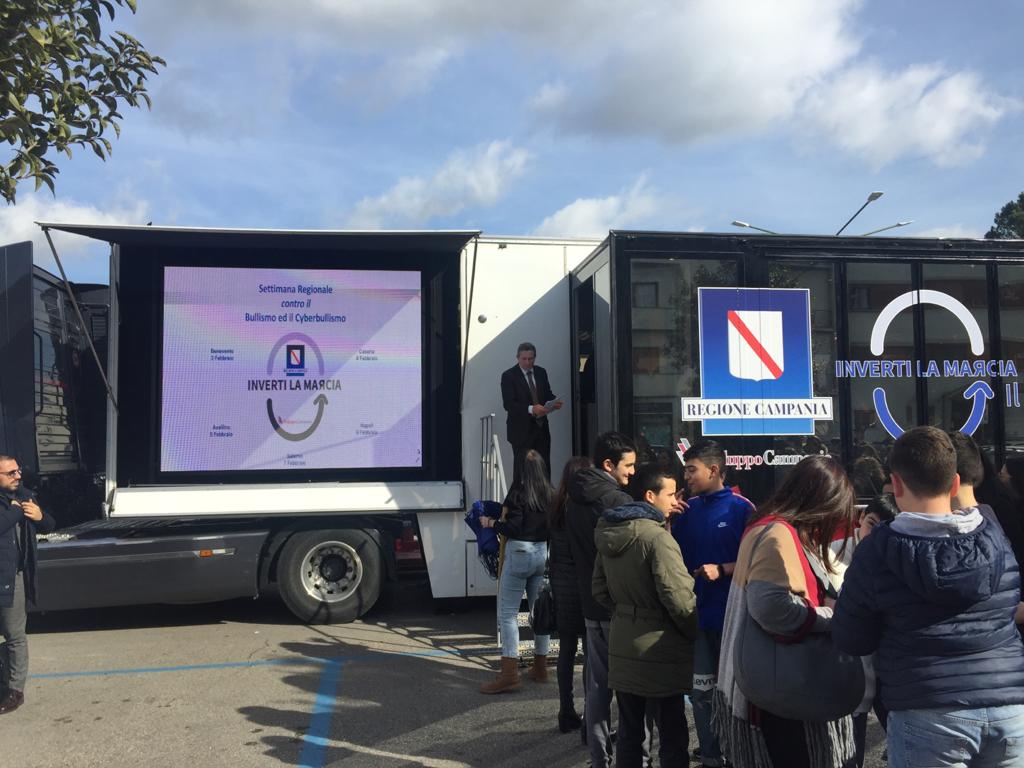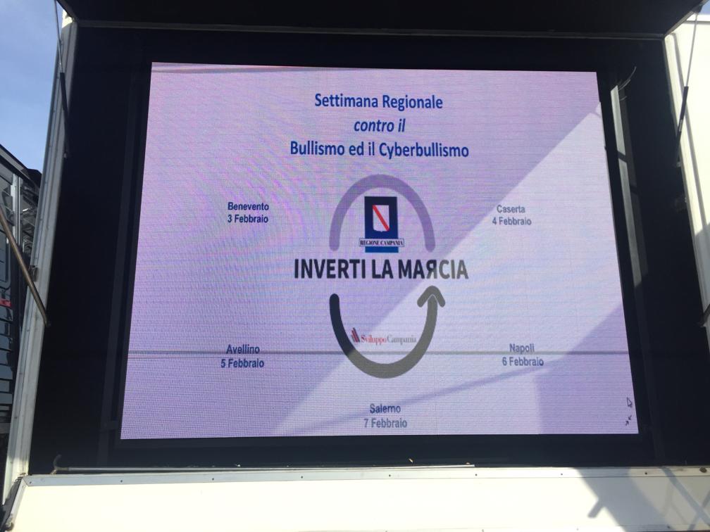 E’ partito da Benevento in piazza Risorgimento,il tour del Truck della Regione Campania per dire basta al bullismo e cyberbullismo. “Inverti la marcia” è il messaggio che sarà replicato il 4 febbraio a Caserta e poi ad Avellino, Napoli e Salerno nell’ambito della settimana regionale contro il bullismo e cyberbullismo. Il senso del progetto itinerante è quello di arginare il circolo vizioso di comportamenti aggressivi e vessatori.