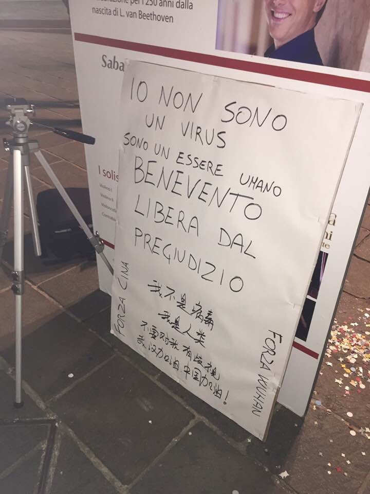 “Io non sono un virus, sono un essere umano, Benevento libera dal pregiudizio”. Sono queste le parole che un cittadino di Benevento di origini cinesi ha scritto su un cartello apparso in città.