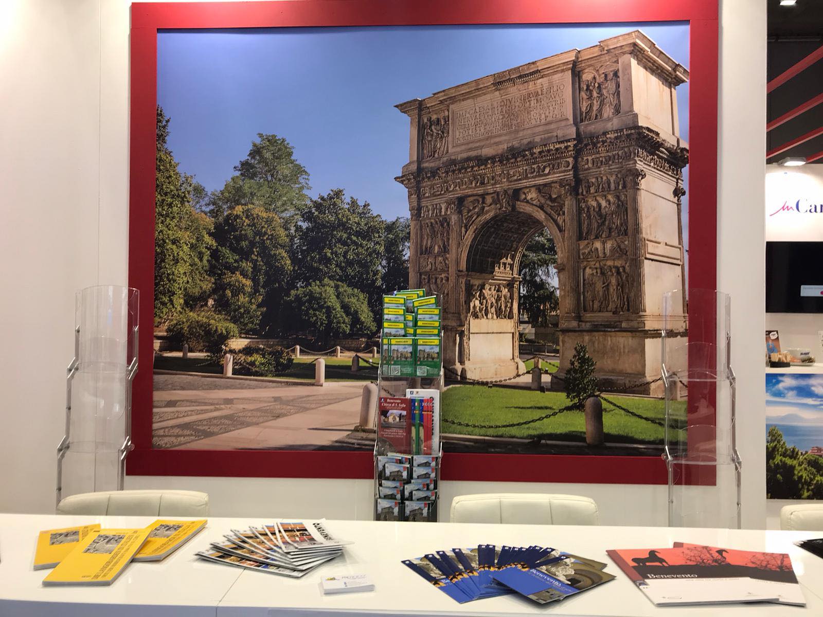 All’interno dello stand c’era uno spazio dedicato interamente alla città di Benevento con un allestimento che mostrava le incredibili bellezze della città attraverso una serie di immagini. Importante e di grande effetto l’immagine sulla parete di fondo con tutta l’imponenza dell’Arco di Traiano che insieme alle altre immagini che decoravano lo spazio, la proiezione continua di un filmato e il materiale promozionale disposto sul desk, rendevano immediatamente riconoscibile la città, con il risultato di avere un’ottima visibilità pur nella difficoltà dell’affollamento dell’offerta.