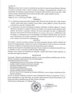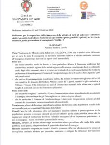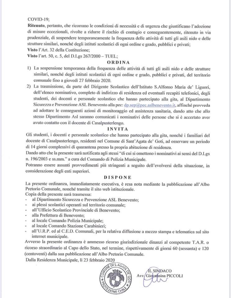 Scuola chiuse a Sant’Agata de goti fino a giovedì 27. L ordinanza emessa poco fa a scopo precauzionale dal sindaco Giovannina Piccoli fa riferimento a due episodi legati ai luoghi focolaio del Coronavirus. Il primo riguarda la presenza nel territorio saticulano nei giorni scorsi di un docente di Casalpusterlego, l’altro fa riferimento ad una gita scolastica fatta dagli alunni dell istituto Sant’Alfonso Maria de Liguori a Milano e Verona è terminata ieri con il ritorno a Sant’Agata. A scopo precauzionale là Piccoli invita gli alunni, docenti e il personale della scuola che ha partecipato alla gola e i familiari del docente di Casalpusterlengo ad un periodo di isolamento di 14 giorni.