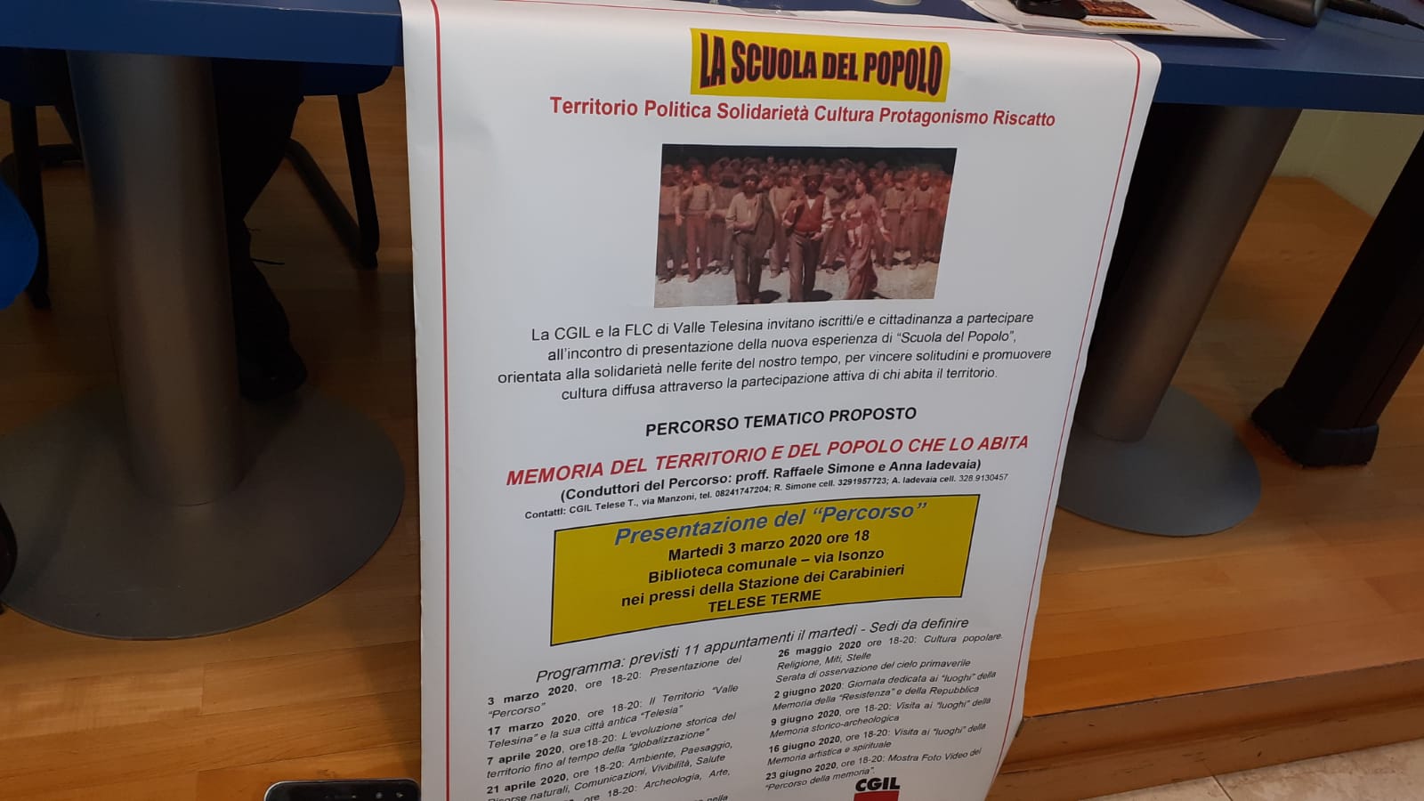Parte alla CGIL di Benevento “la Scuola del Popolo” . Una dicitura d’antan che percorre larghi tratti della storia civile e dell’impegno sociale del maggiore sindacato italiano. Sotto l’egida del Quarto Stato, la Scuola del Popolo, nel complesso di 11 appuntamenti da marzo a giugno, si propone di essere uno spazio franco in cui anziani ma anche giovani possano trovare il modo di socializzare e di interagire per creare una rete di interessi tale da fornire servizi e nozioni a coloro che ne richiedano. Si parte dalla Valle Telesina martedì 3 marzo e toccherà la Valle Caudina e il capoluogo Benevento. Un working progress, nelle intenzioni della CGIL, che dovrà essere prodromica ad una iniziativa che si spera possa durare nel tempo, una sorta di Casa del Popolo capace di costituire un luogo di aggregazione che garantisca sostegno alle classi più svantaggiate e non soltanto. Territorio, politica, solidarietà, cultura protagonismo riscatto lo slogan che accompagna la scuola del popolo.