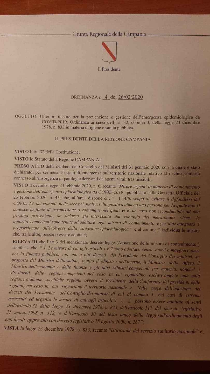 Questo è quanto emerge dall’ordinanza della Regione Campania a firma del governatore Vincenzo De Luca.